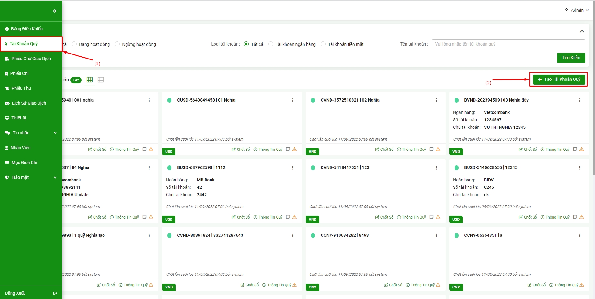 Bước 1: chọn Menu => Tài khoản quỹ (1) => Tạo tài khoản quỹ (2)