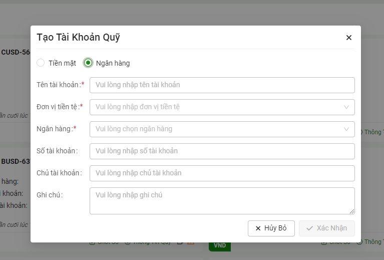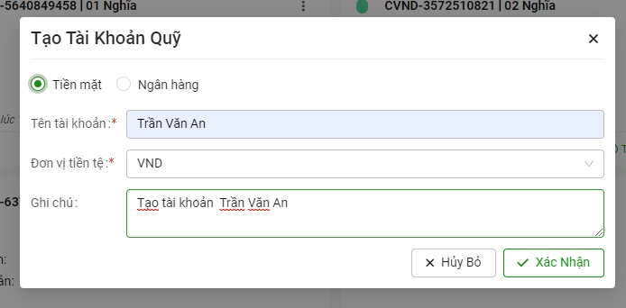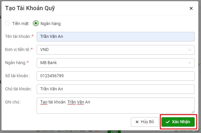 Bước 2: Chọn tài khoản quỹ cần tạo (tiền mặt hoặc tài khoản ngân hàng) => Điền thông tin tên tài khoản => Đơn vị tiền tệ => Ghi chú (nếu có) => Chọn Xác nhận