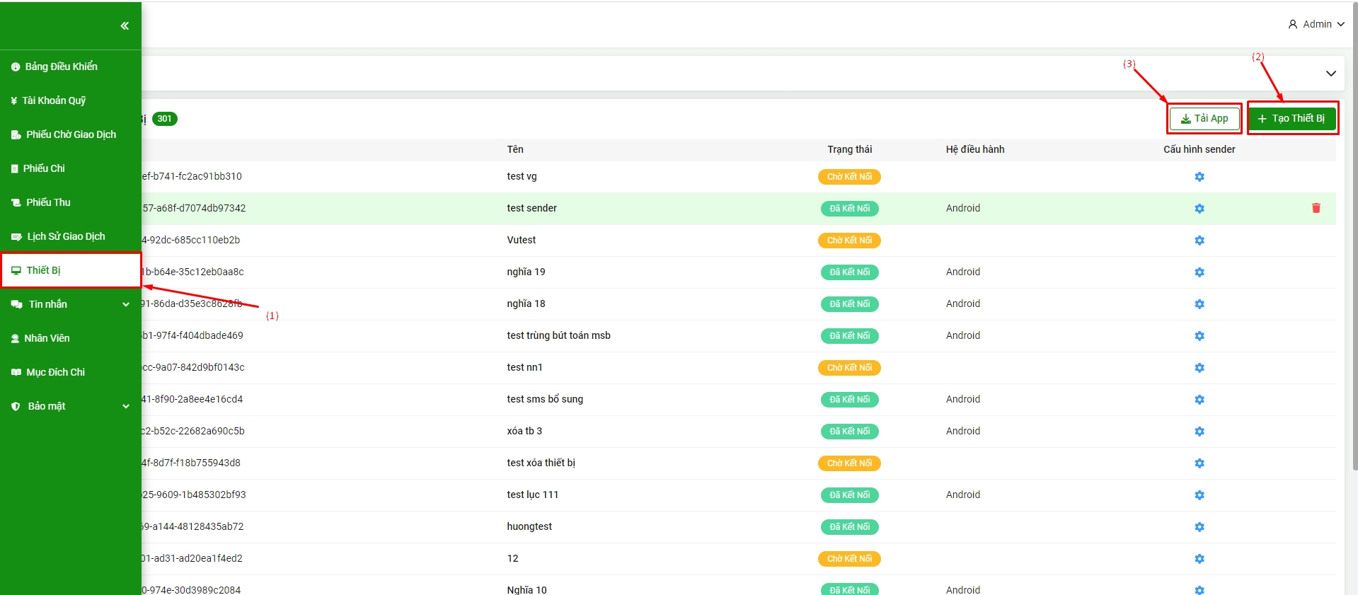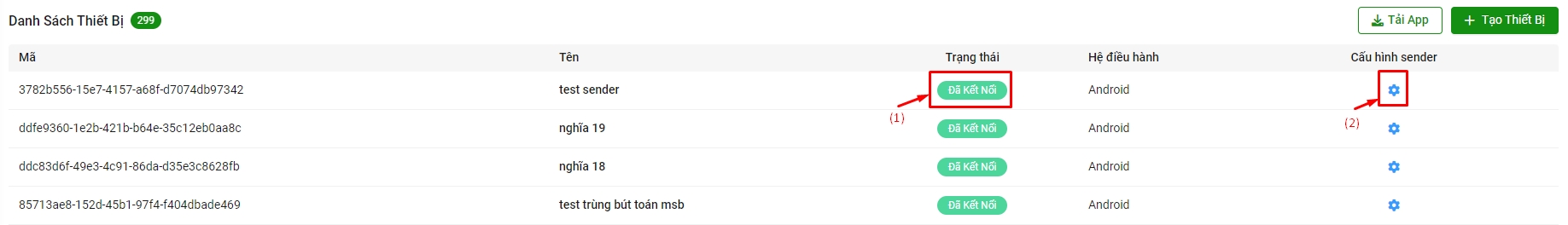 Bước 1: Để kết nối tới app mobile, Quý khách chọn Menu => Thiết bị (1) => Tạo thiết bị (2)