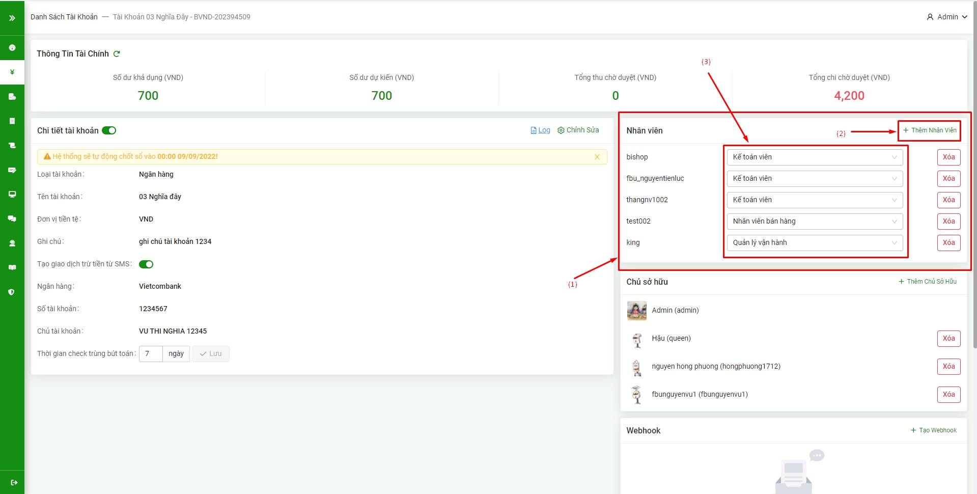 Bước 2: Trong chi tiết tài khoản mục Nhân viên (1) => Thêm nhân viên để thêm nhân viên mới hoặc có thể thay đổi quyền của nhân viên cũ (3)