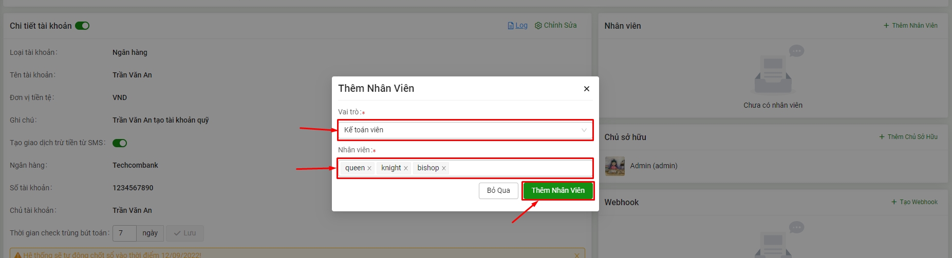 Chọn Thêm nhân viên (2) hệ thống sẽ hiển thị vai trò và danh sách nhân viên. (1 vai trò có thể chọn nhiều nhân viên)