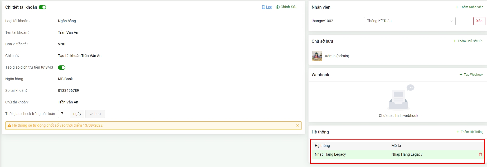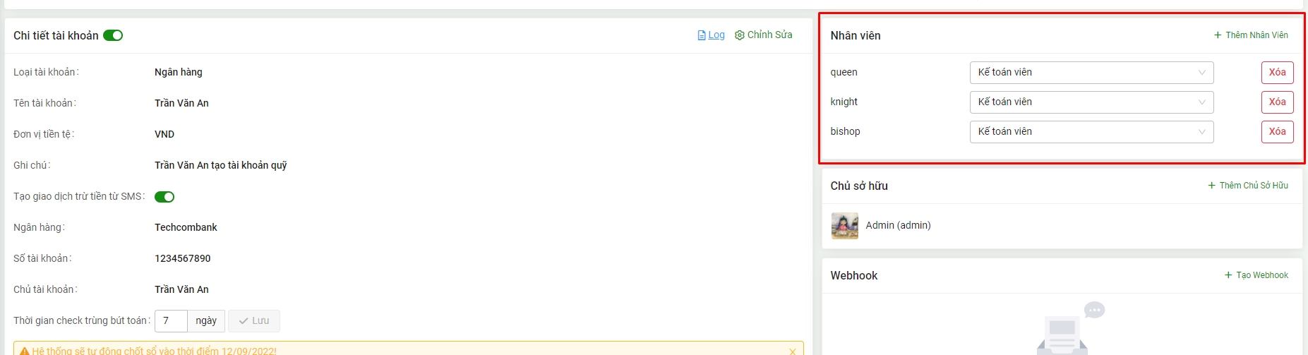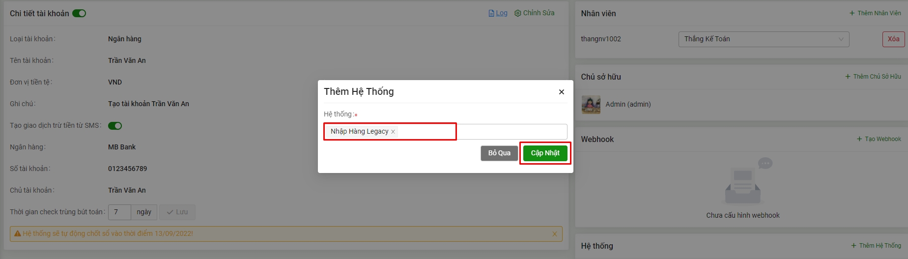 4. Thêm hệ thống cho tài khoản quỹ