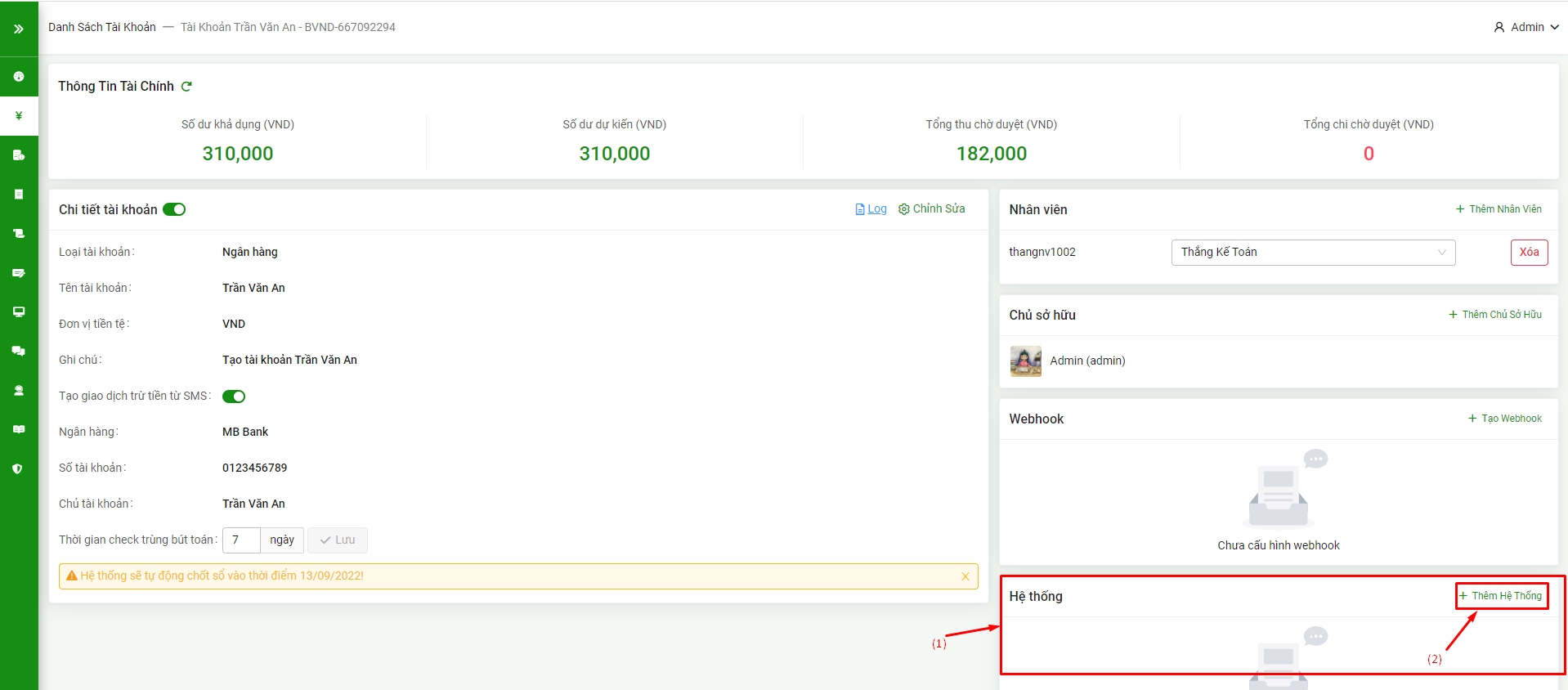 Bước 1: Tại chi tiết tài khoản quỹ mục Hệ Thống (1) => Thêm hệ thống (2)