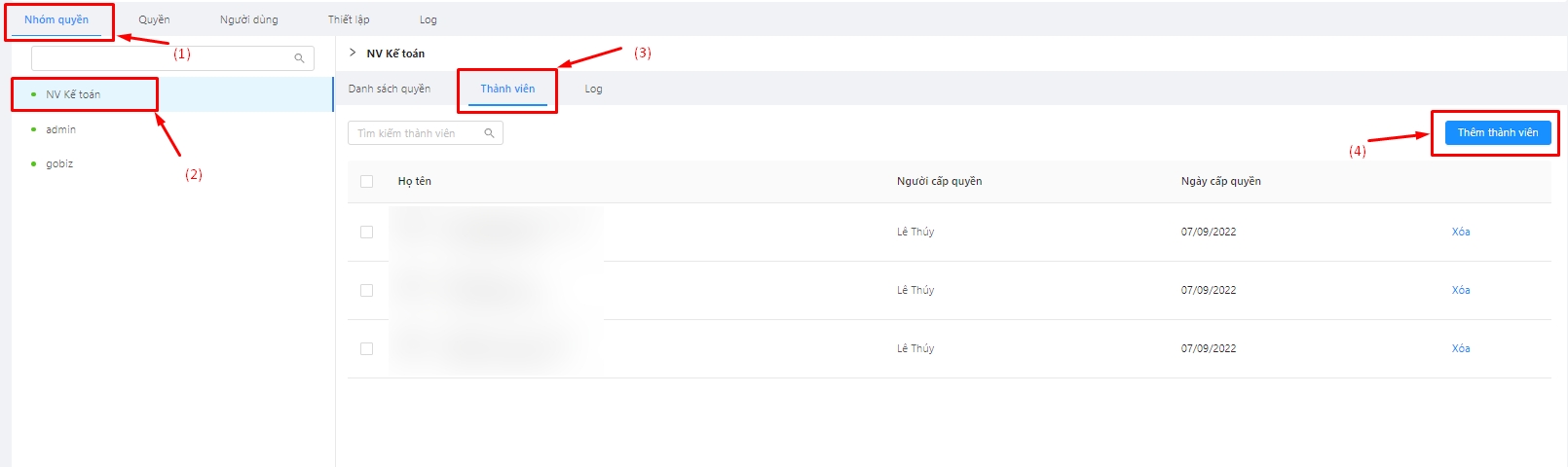Bước 1: Sau khi thêm người dùng vào hệ thống Quý khách chọn tab Nhóm quyền (1) -> chọn quyền trong danh sách quyền (2) -> Thành viên (3) -> Thêm thành viên (4)