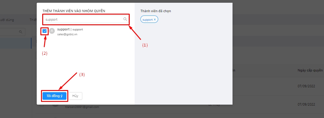Bước 2: Tìm kiếm tên thành viên (1) => tick (2) để chọn thành viên => chọn Tôi đồng ý (3) để thêm thành viên.
