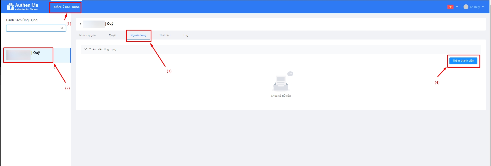 **Bước 1: Chọn quản lý ứng dụng (1) -> trong danh sách tìm ứng dụng Quỹ (2) -> Người dùng (3) -> Thêm thành viên (4)