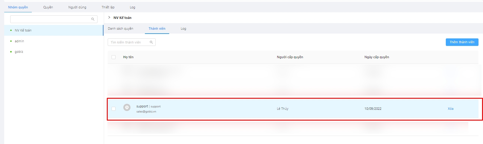Thành viên vừa chọn đã được phân quyền vào hệ thống thành công như hình:
