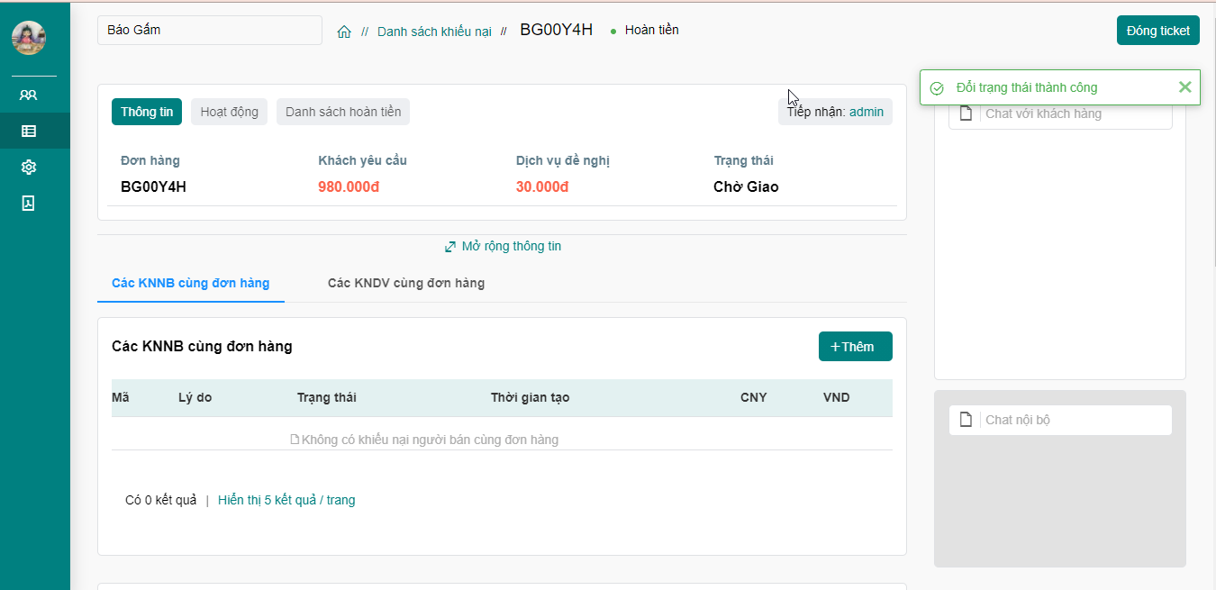 Sau khi duyệt hoàn tiền, Khiếu nại sẽ chuyển sang trạng thái Hoàn tiền, số tiền hoàn được cộng vào ví điện tử của Khách hàng.
