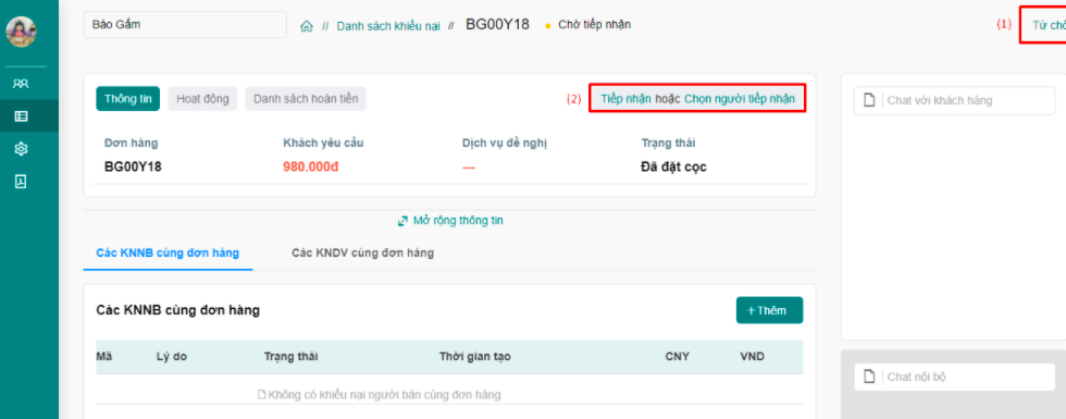 Bước 2: Tại giao diện chi tiết Khiếu nại chọn từ chối khiếu nại (1) để kết thúc khiếu nại luôn hoặc chọn “Tiếp nhận” hay phân công Khiếu nại cho Nhân viên khác xử lý (2).