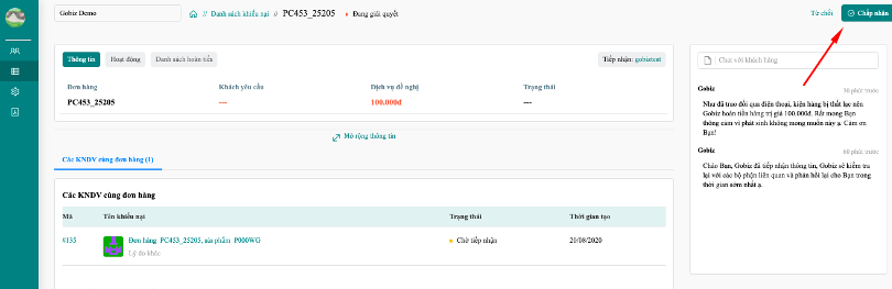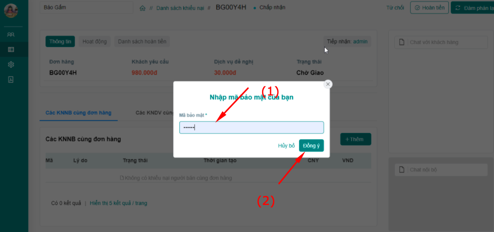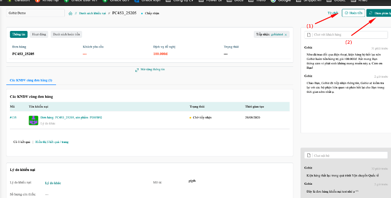 Bước 2: Bấm nút hoàn tiền (1) hoặc bấm nút Đàm phán lại (2) trong tình huống Khiếu nại xử lý chưa đúng/chưa thoả đáng để yêu cầu xử lý lại Khiếu nại cho Khách hàng.
