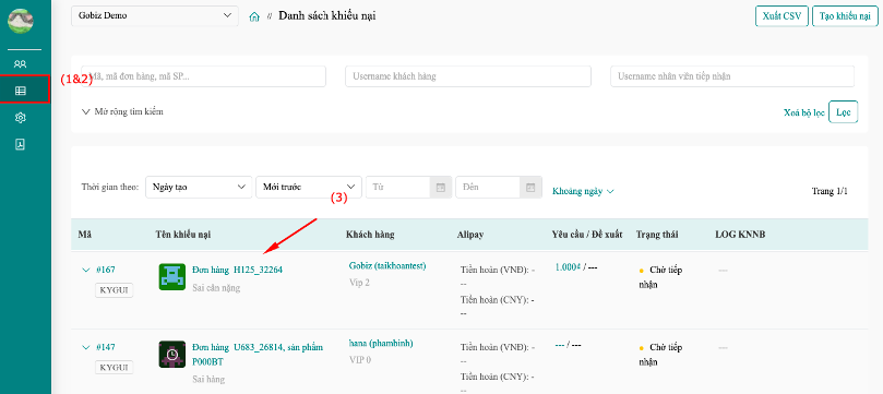 Bước 1: Menu -> Danh sách Khiếu nại (1) -> Chờ tiếp nhận (2) -> Click vào mã đơn hàng để mở chi tiết KN (3)