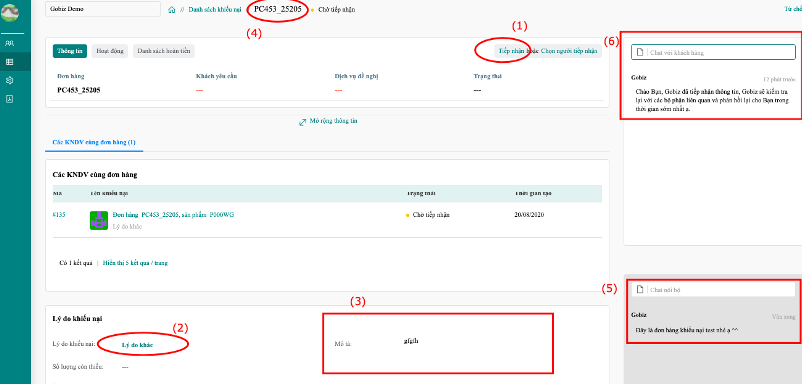 Bước 1: Xem lý do Khiếu nại của Khách hàng (2) -> Kiểm tra phần mô tả lỗi, ảnh/video, trao đổi trước đó của Khách hàng (3) -> Mở chi tiết đơn hàng ra để kiểm tra (4) -> Lưu ý nội bộ nếu có (5) -> Phản hồi thông tin cho Khách hàng (6).
