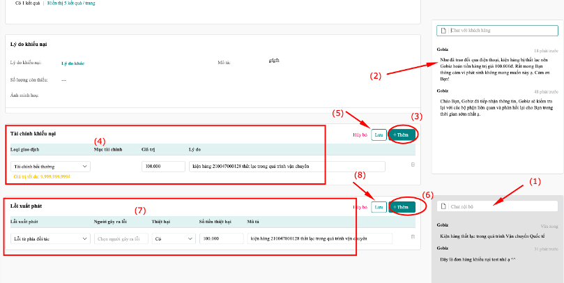 Bước 1: Ghi chú nội bộ thông tin nếu có (1) -> Phản hồi thông tin chốt lên Khiếu nại cho Khách hàng (2) -> Chọn “ thêm” để tạo tài chính cần hoàn (3) -> Tạo tài chính Khiếu nại (4) -> Lưu (5) -> Chọn “Thêm” tại mục lỗi xuất phát nếu có (6) -> Điền nội dung lỗi xuất phát (7) -> Chọn “Lưu” (8).