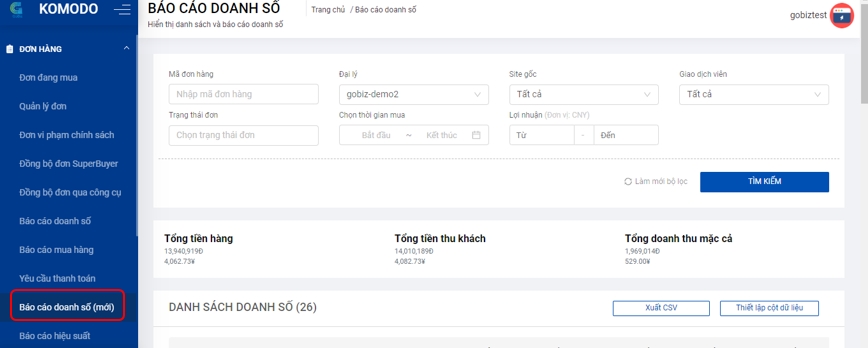 Từ thanh menu, quý khách chọn đơn hàng => báo cáo doanh số
