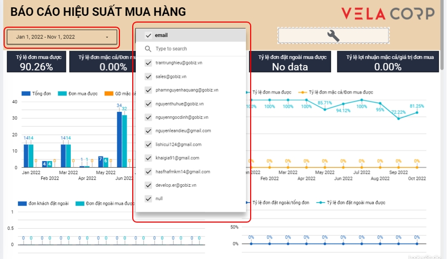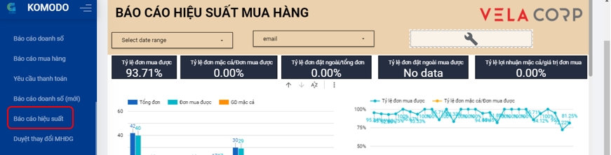 Tại giao diện chính, quý khách có thể kiểm tra hiệu suất mua hàng của nhân viên bằng việc chọn khoảng thời gian và email nhân viên muốn thống kê. Hệ thống sẽ thống kê hiệu quả mua hàng của nhân viên.