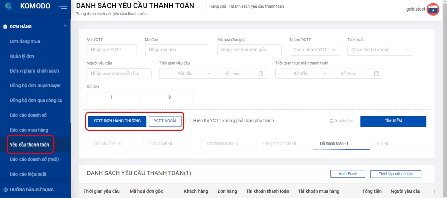 Bước 1: Từ thanh menu, quý khách chọn đơn hàng => yêu cầu thanh toán. Trên giao diện chính, quý khách sẽ chọn kiểm tra yêu cầu thanh toán của đơn thường hoặc đơn ngoài.