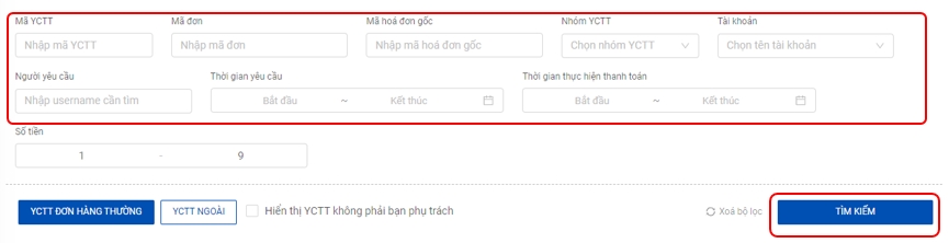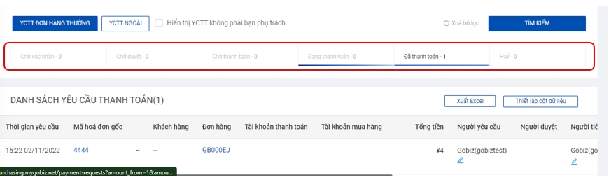 Ngoài ra, quý khách có thể kiểm tra danh sách các yêu cầu thanh toán dựa vào thanh phân loại đơn: chờ xác nhận, chờ duyệt, chờ thanh toán, đang thanh toán, đã thanh toán, hủy