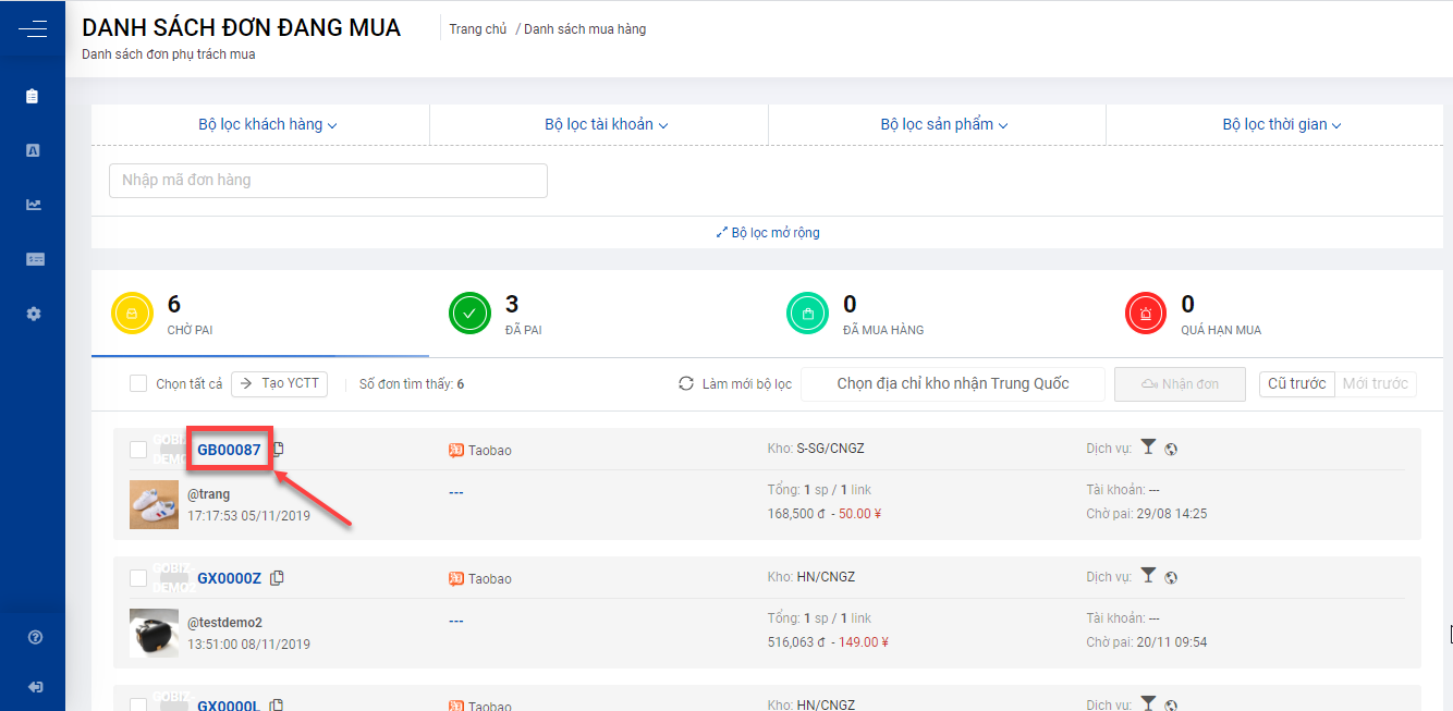 GDV sẽ chỉ xem được các đơn hàng được phân cho mình tại mục Đơn đang mua