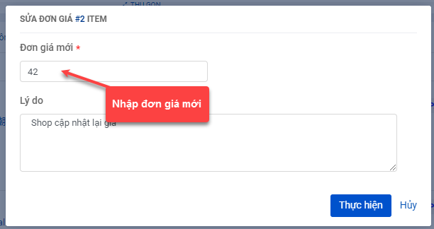 GDV nhập giá mới của sản phẩm và click Thực hiện để hoàn thành sửa giá sản phẩm