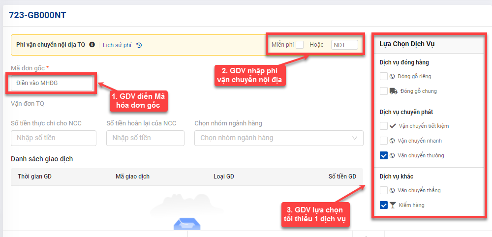 Bước 3: GDV cập nhật các trường thông tin của đơn hàng