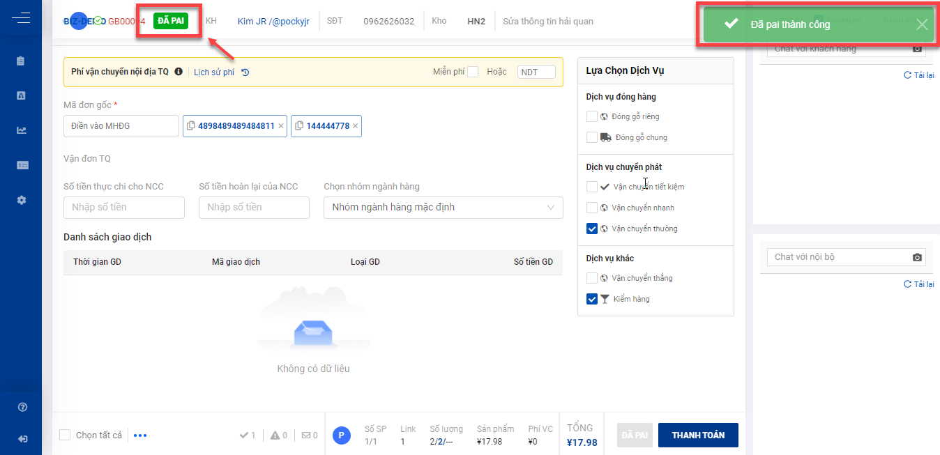 Đơn hàng sẽ hiển thị thông báo "Đã Pai thành công" và chuyển trạng thái đơn sang Đã Pai