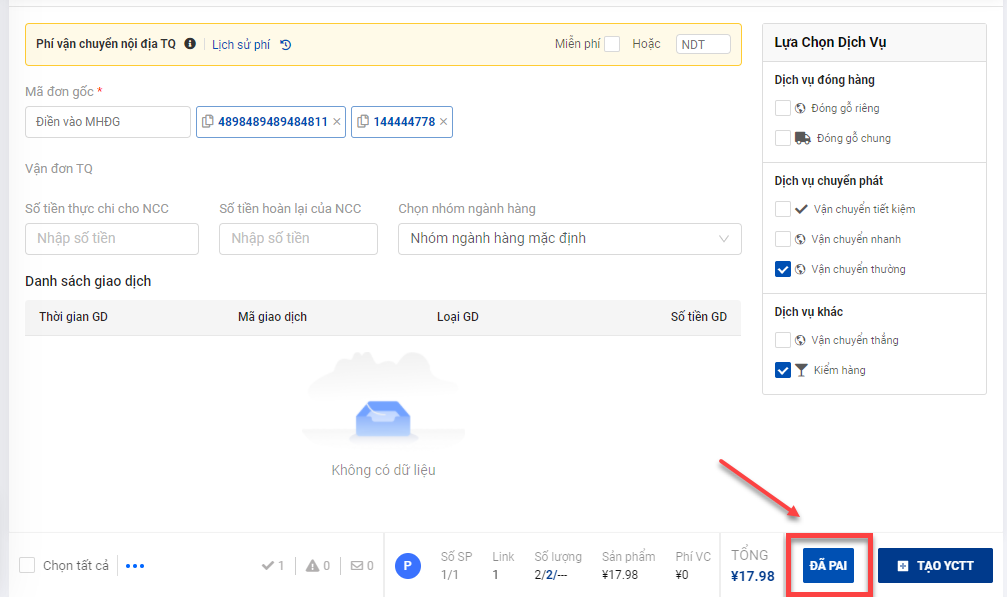 Bước 6: Sau khi điền đầy đủ thông tin đơn hàng, GDV click Đã Pai để chuyển trạng thái cho đơn hàng