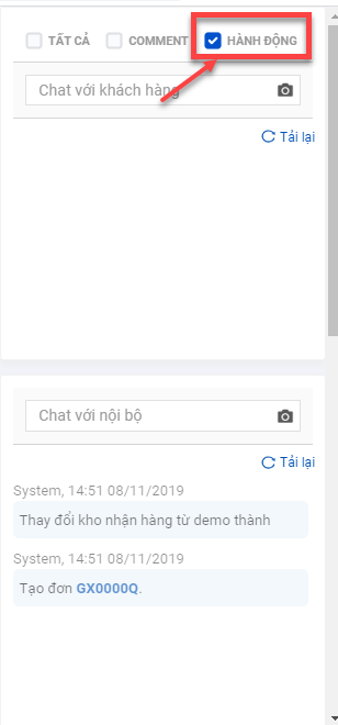 Bước 3: GDV click chọn checkbox Hành động để xem log hành động trên đơn hàng