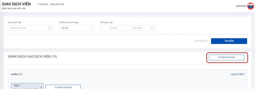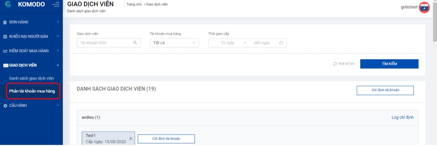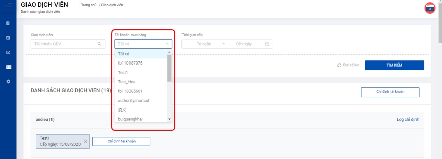 Bước 1: Từ thanh menu, quý khách chọn Giao dịch viên => Phân tài khoản mua hàng