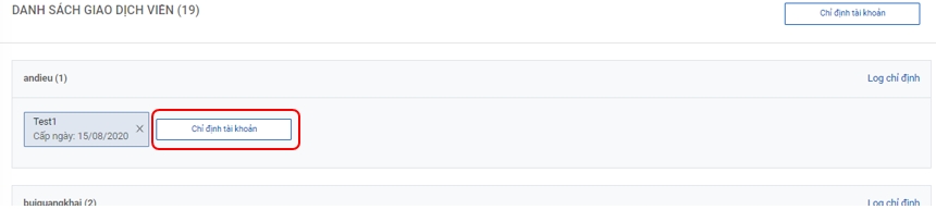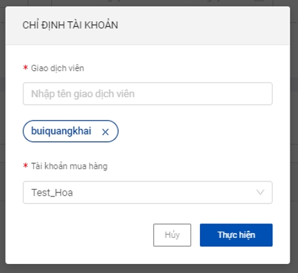 Cách 2: Để phân quyền cho một giao dịch viên, quý khách chọn Chỉ định tài khoản => chọn Tài khoản mua hàng và ấn Thực hiện