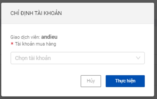 Cách 1: Quý khách chọn Chỉ định tài khoản và lựa chọn Giao dịch viên => Tài khoản mua hàng và ấn Thực hiện