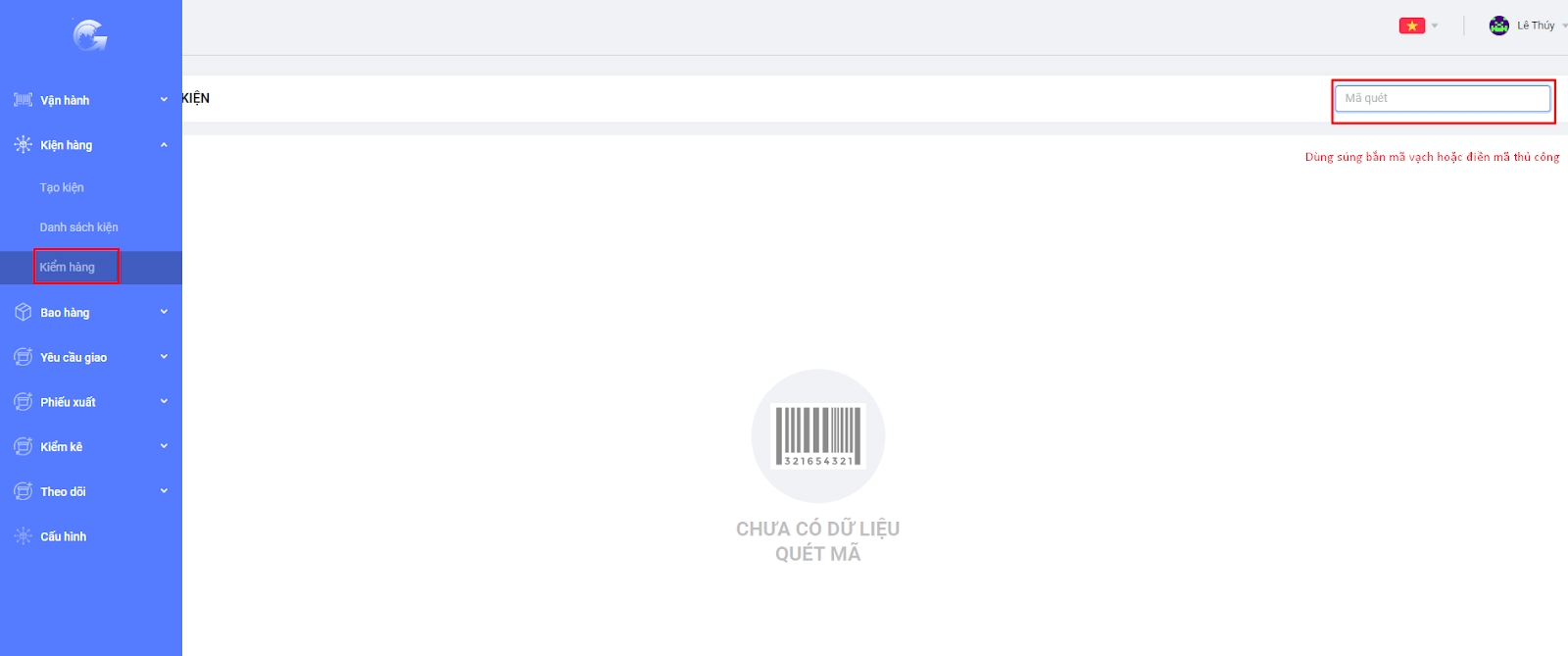 Quý khách dùng súng bắn mã vạch quét mã kiện cần kiểm vào ô trống như hình minh họa