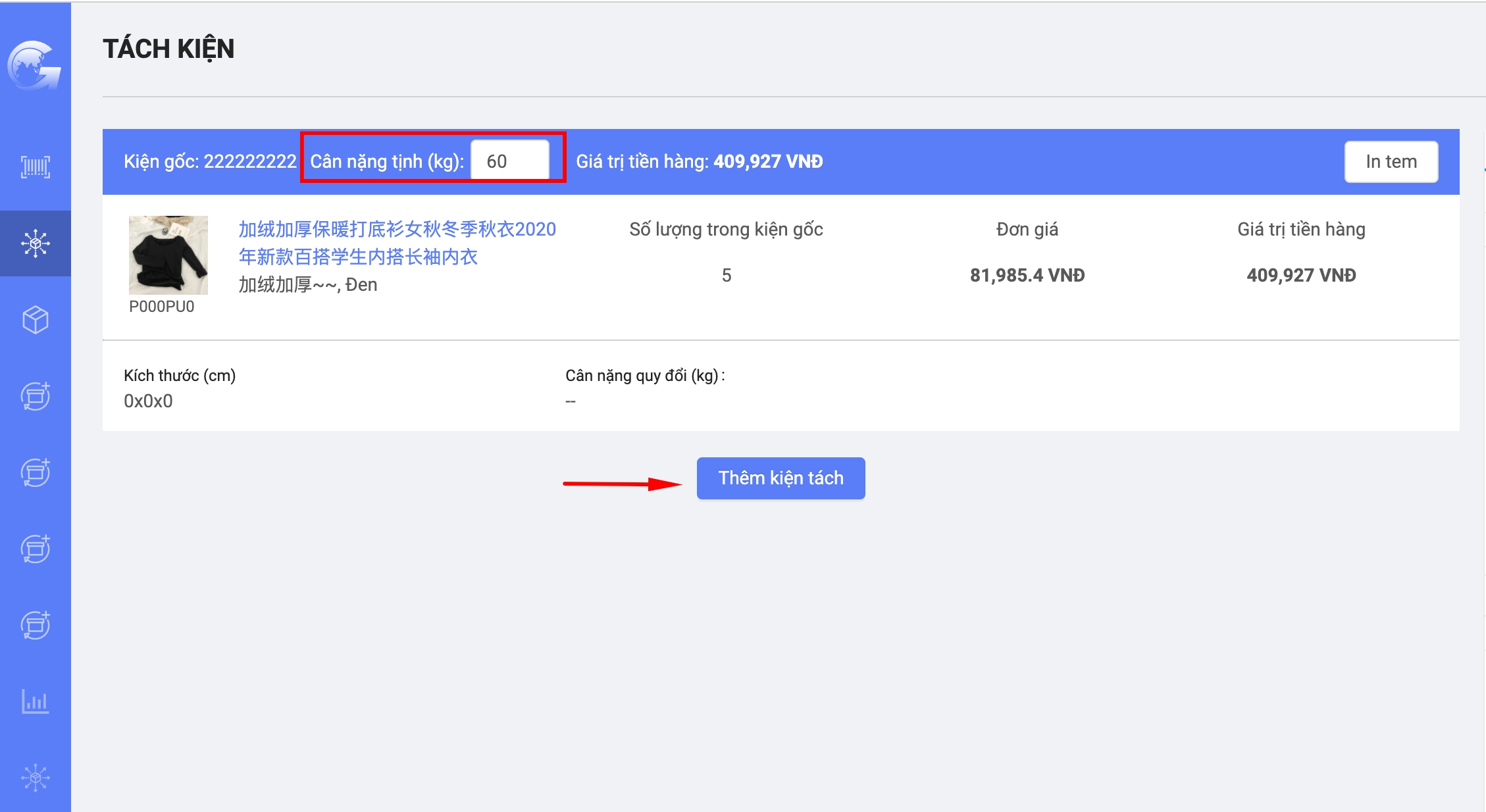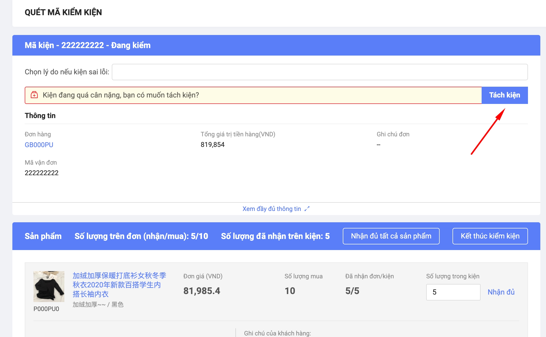 Hệ thống sẽ chuyển hướng từ giao diện Kiểm hàng sang giao diện Tách kiện
