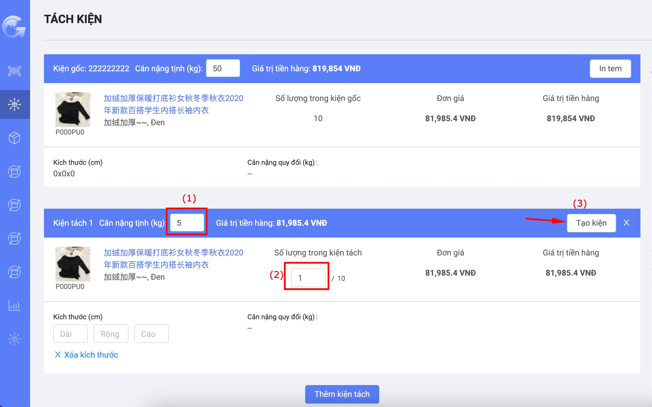 (3) - Quý khách bấm Tạo kiện để hoàn tất quá trình tách hàng hóa