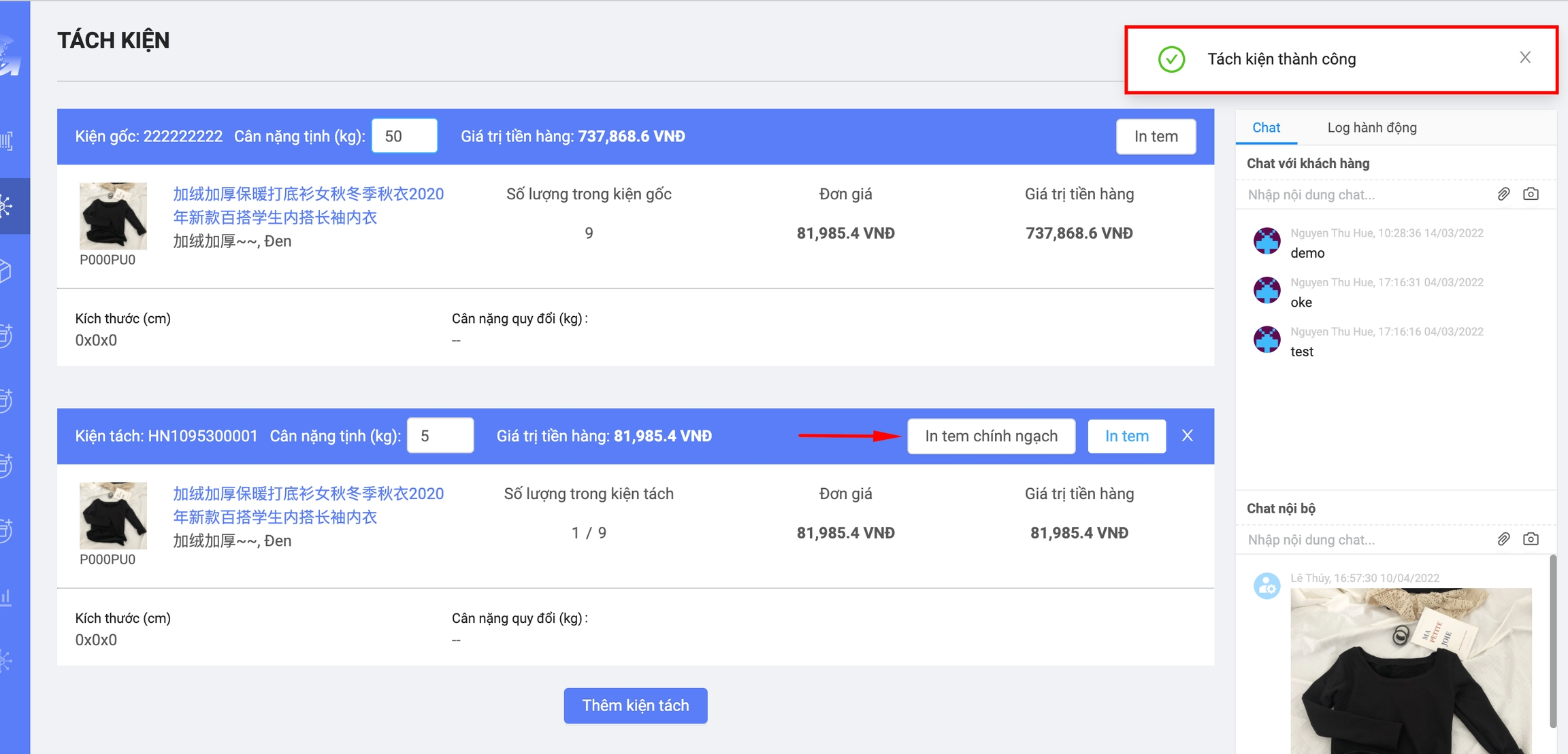 Kiện hàng tách thành công, Quý khách thao tác in tem chính ngạch (TMĐT) và dán lên kiện hàng