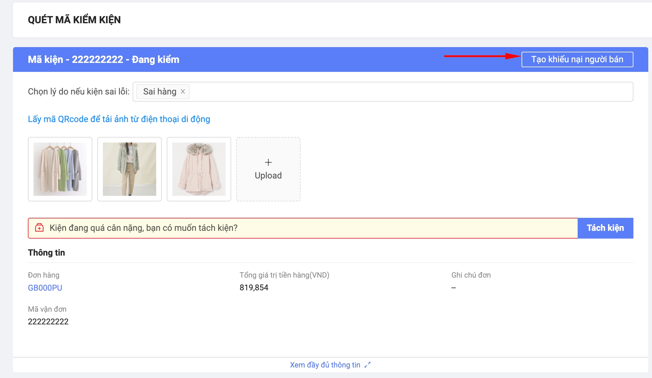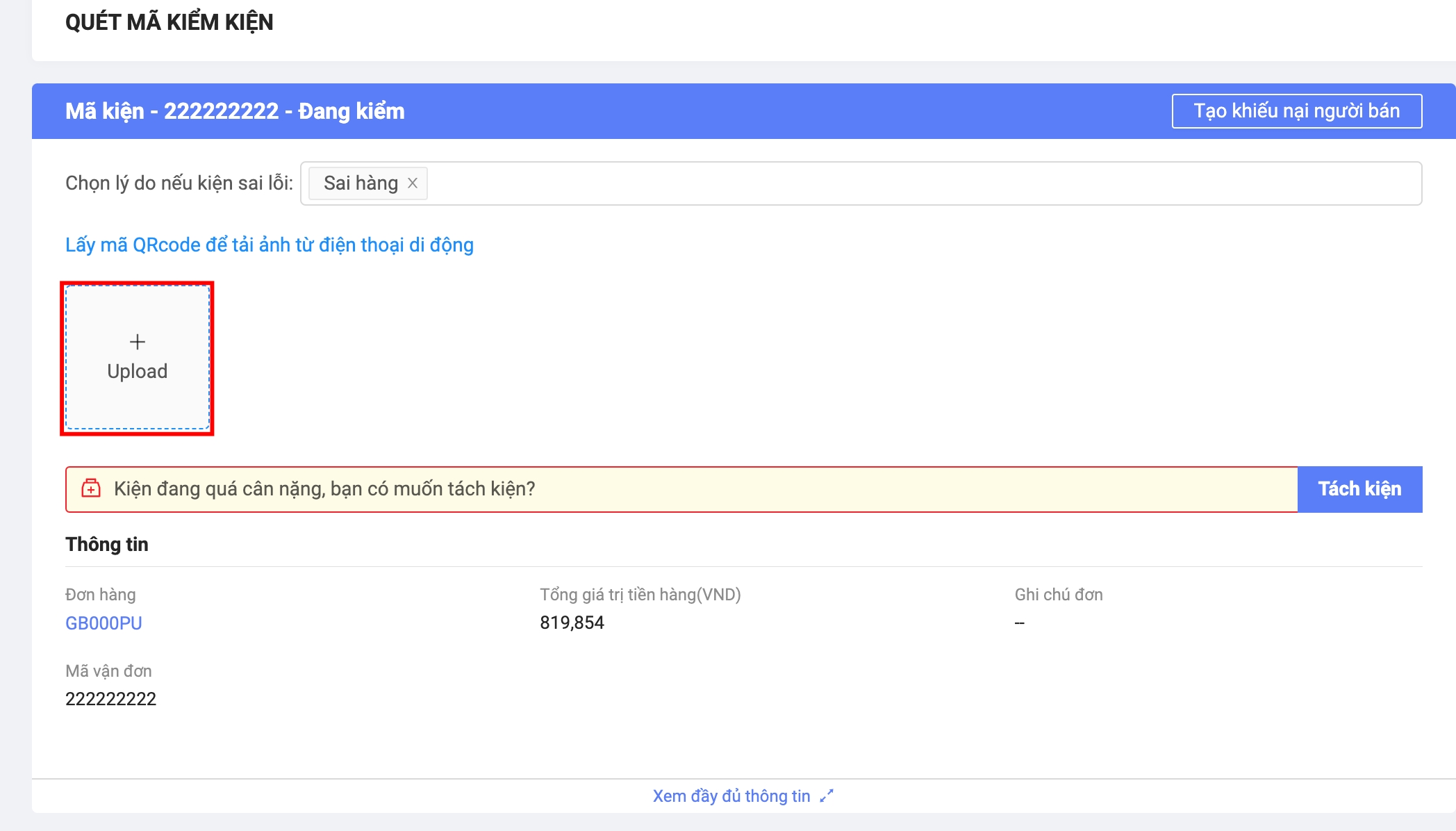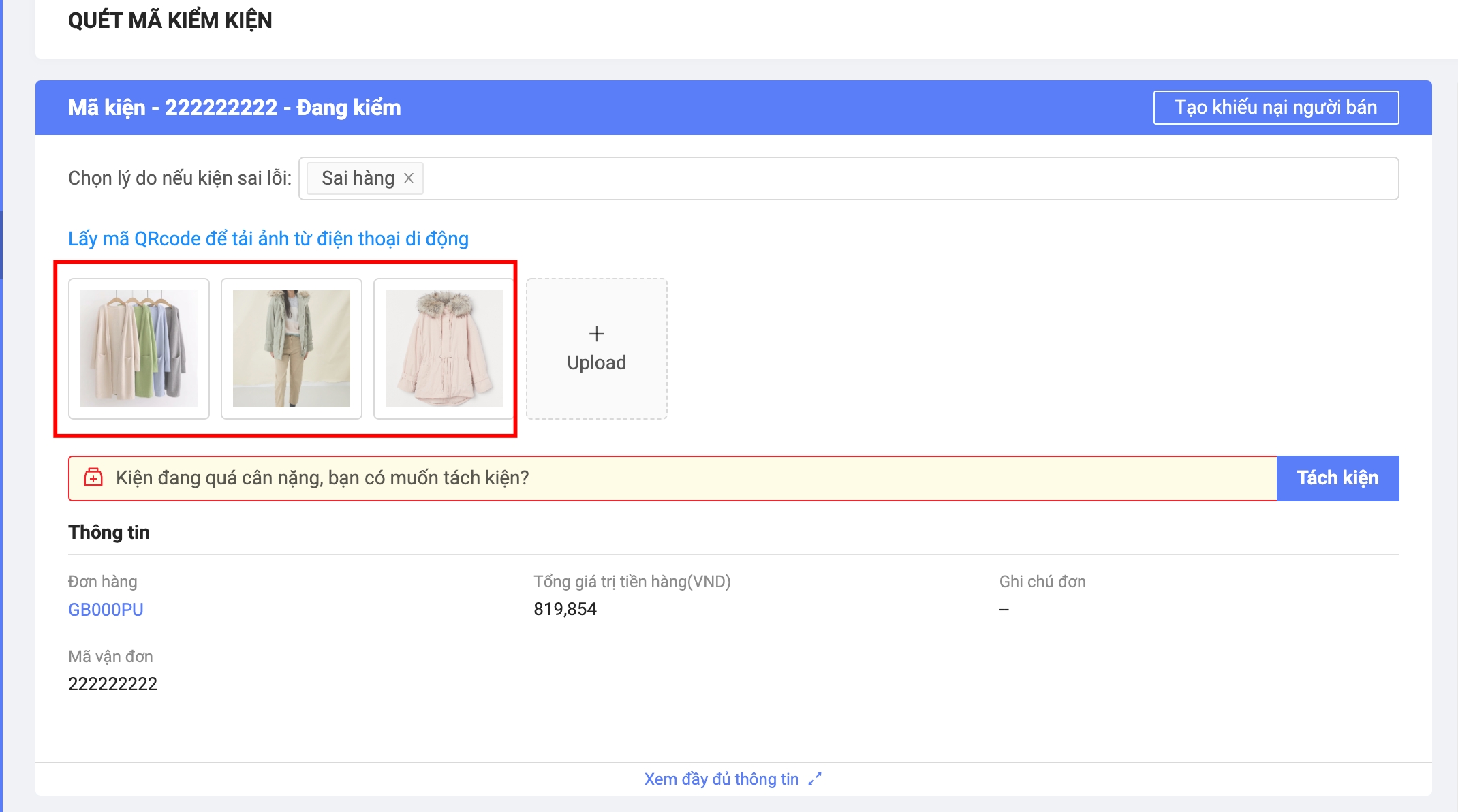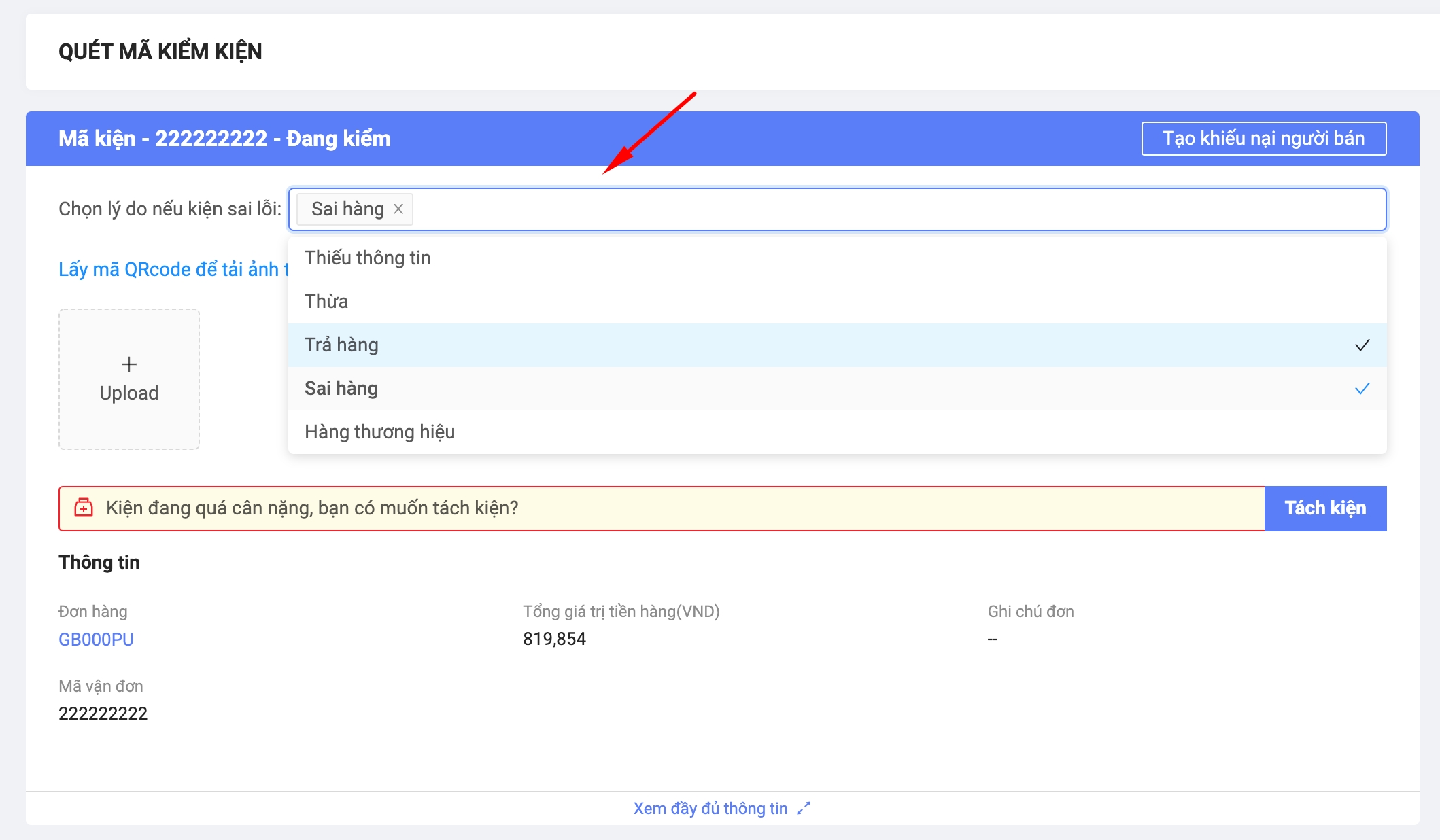 Tại giao diện kiểm kiện, Quý khách chọn lý do đánh dấu kiện hàng sai, lỗi.