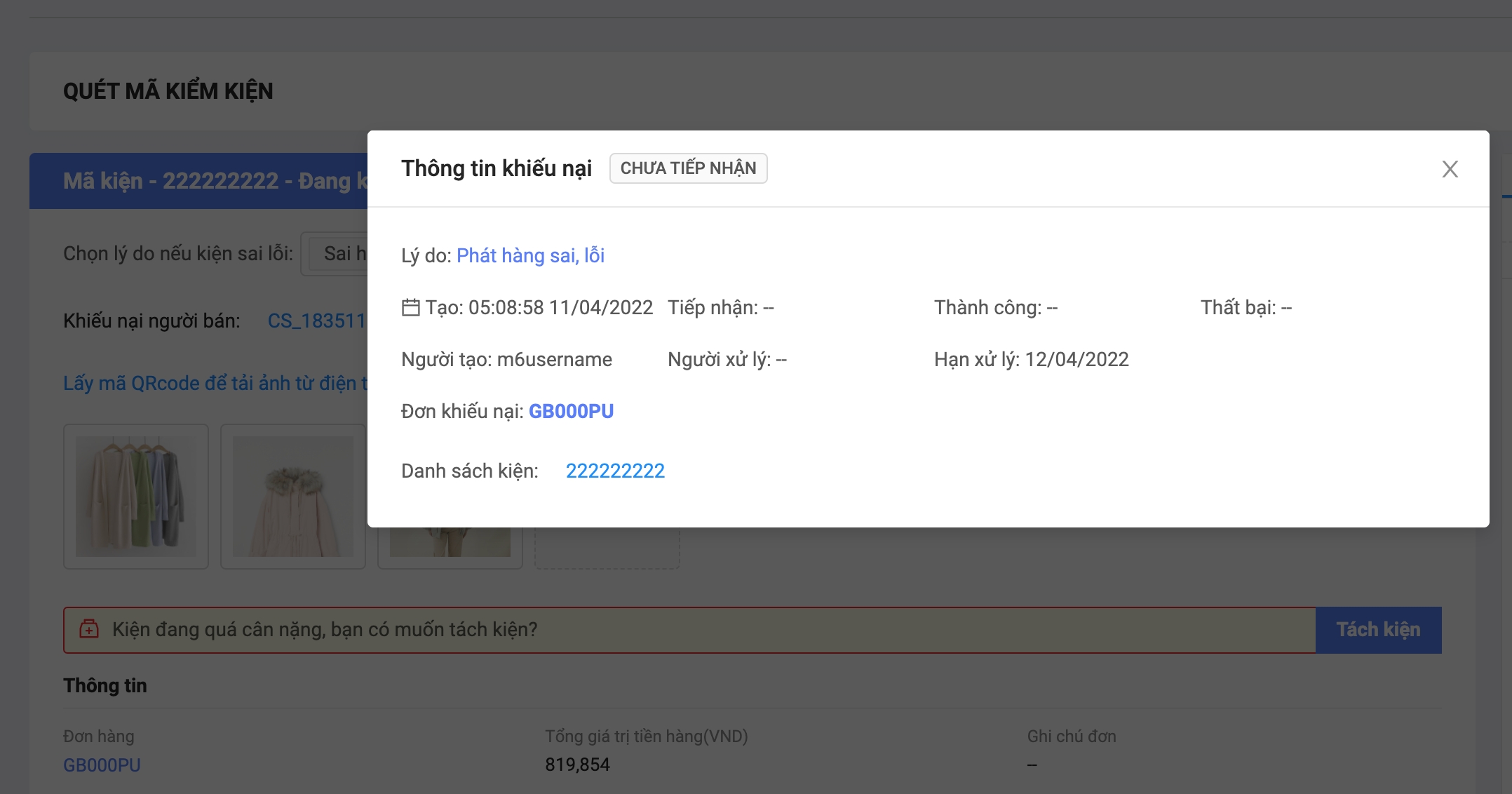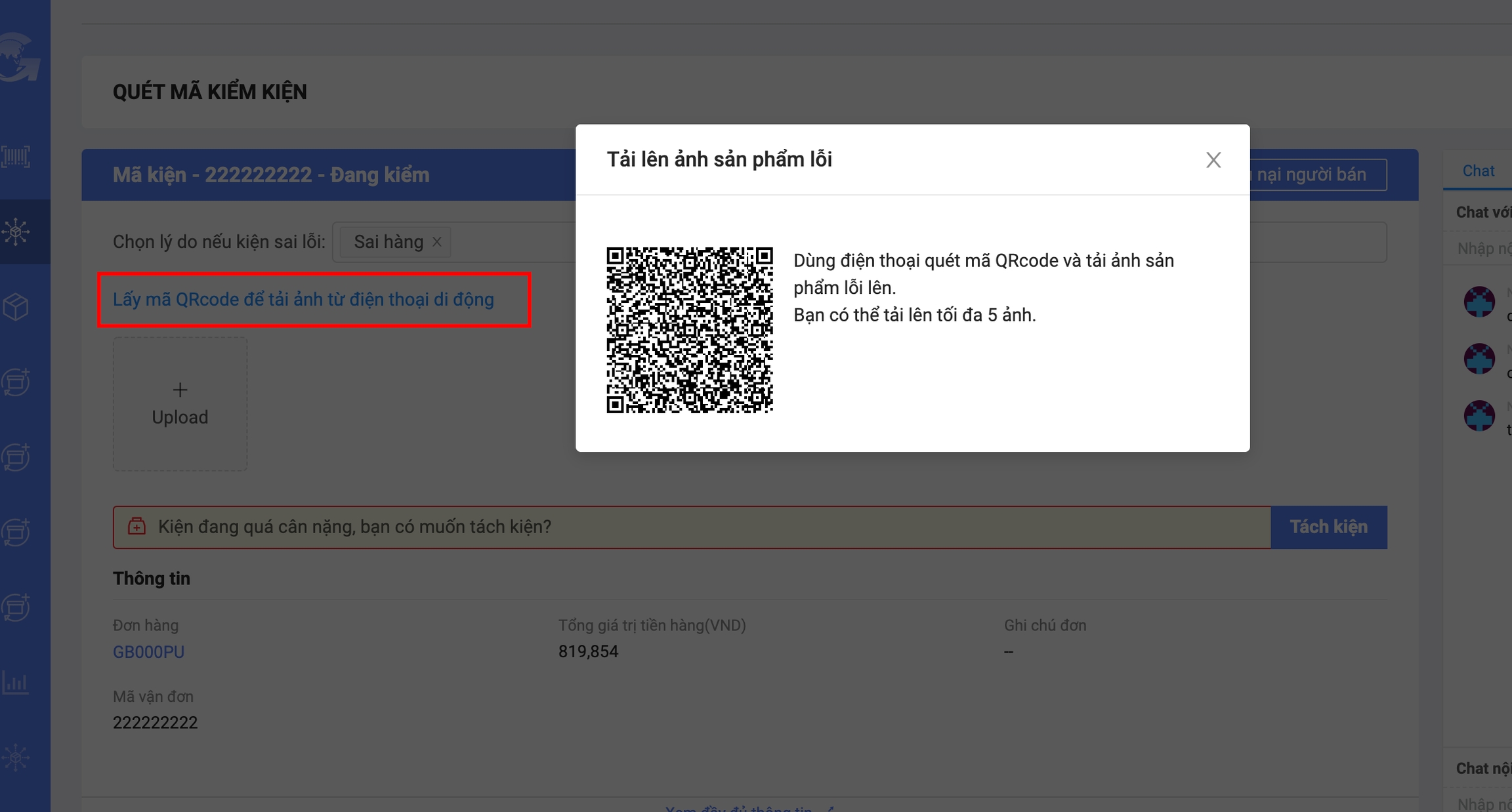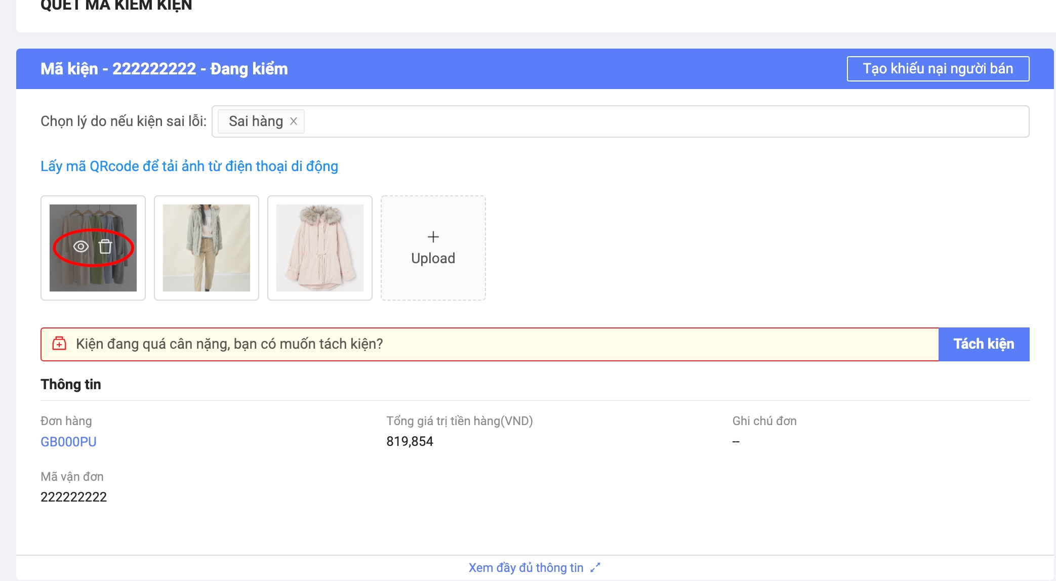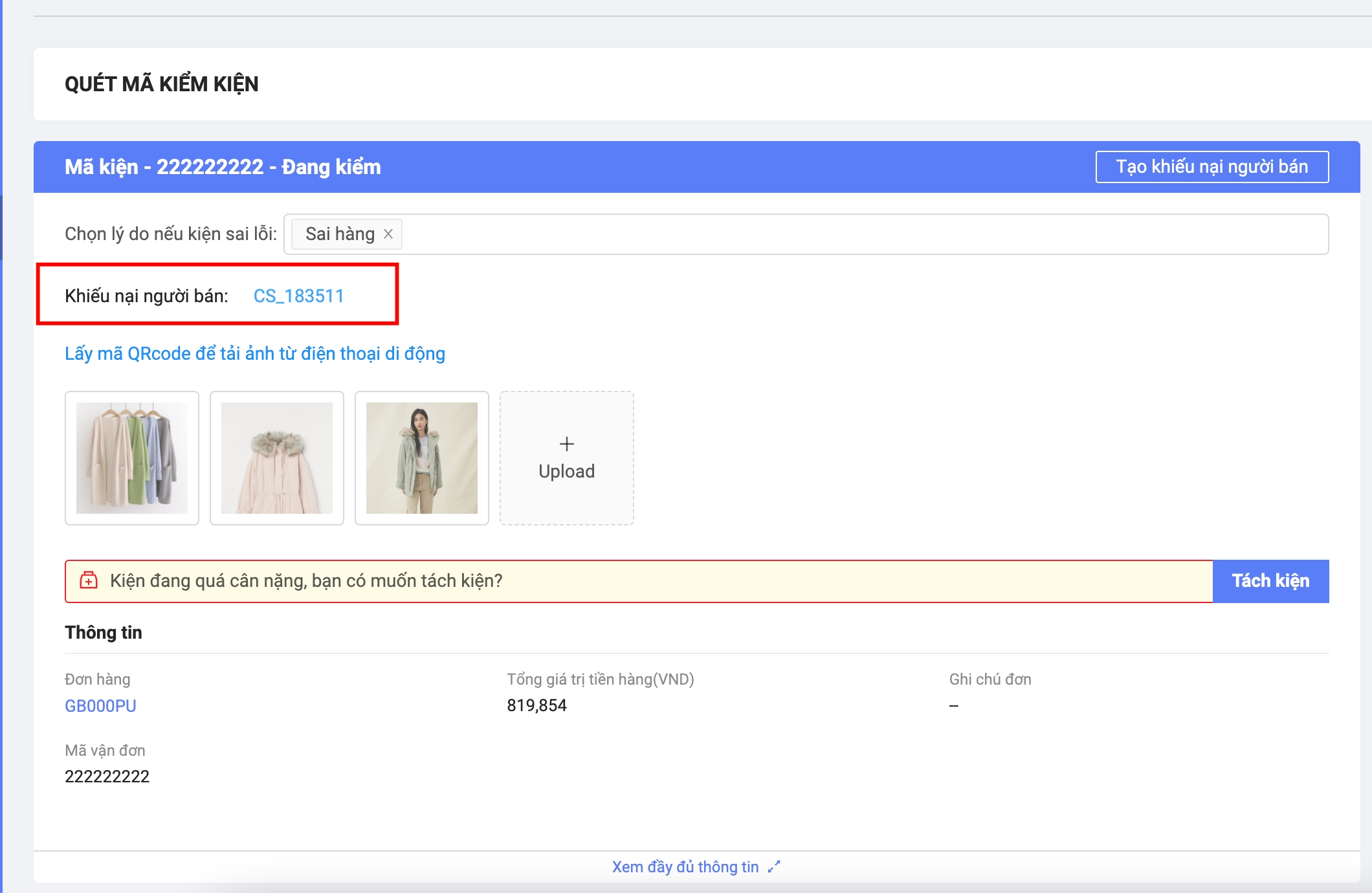 Tại giao diện kiểm kiện, Quý khách chọn lý do đánh dấu kiện hàng sai, lỗi.