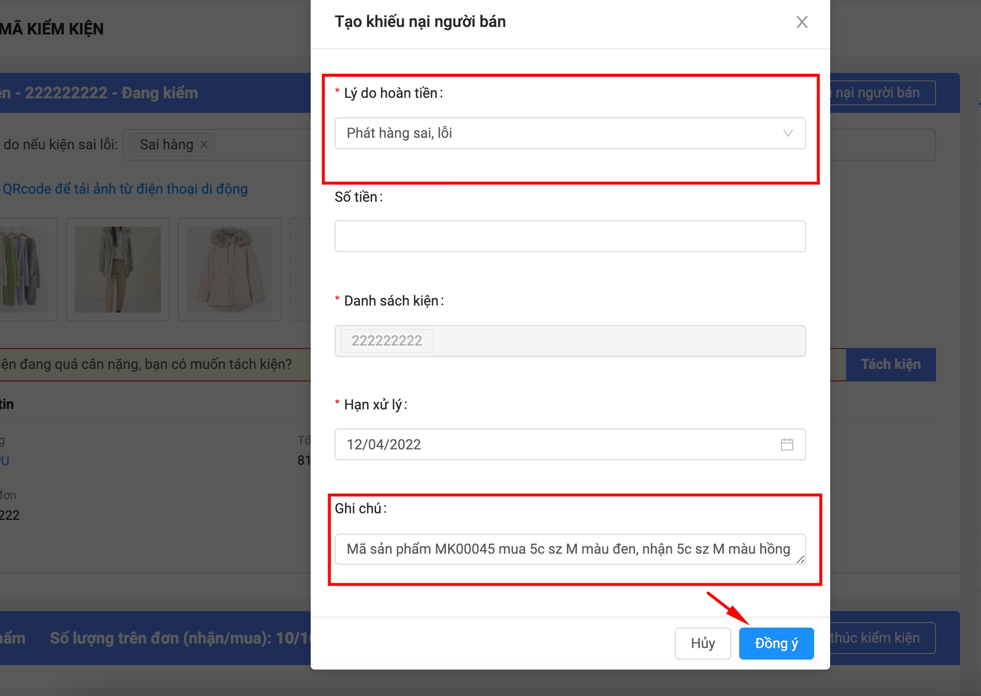 Chọn lý do khiếu nại và điền thông tin chi tiết sai lỗi của kiện hàng/sản phẩm => Bấm Đồng ý để xác nhận tạo KNNB