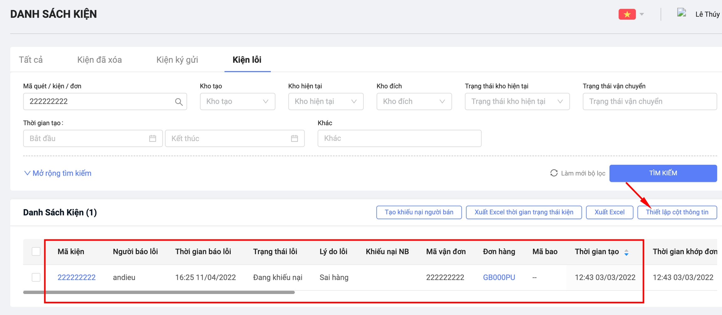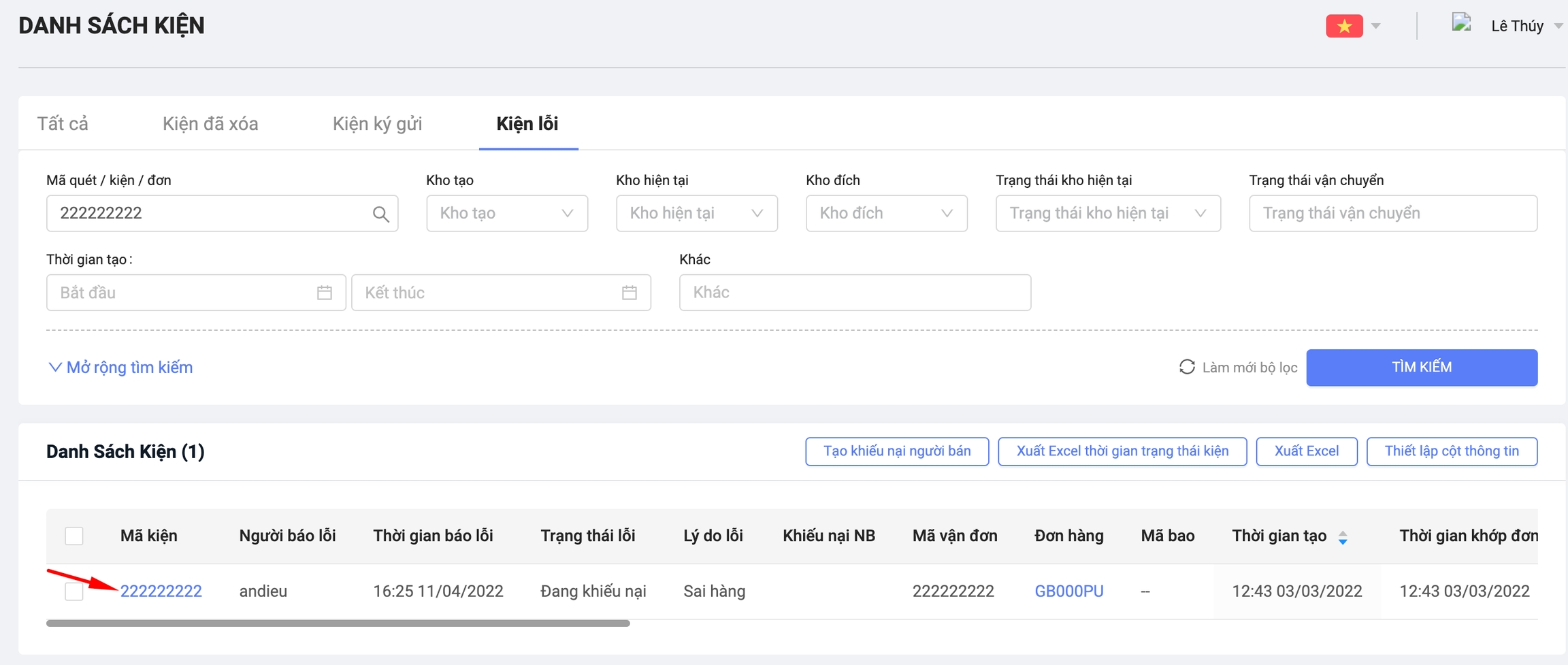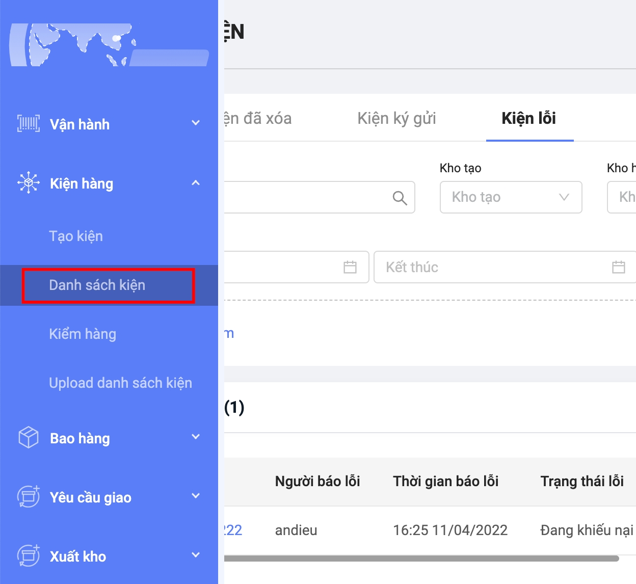 Quý khách có thể quản lý, tìm kiếm các kiện hàng được dánh dấu sai, lỗi tại **Menu ** => Kiện hàng => **Danh sách kiện ** => Kiện lỗi