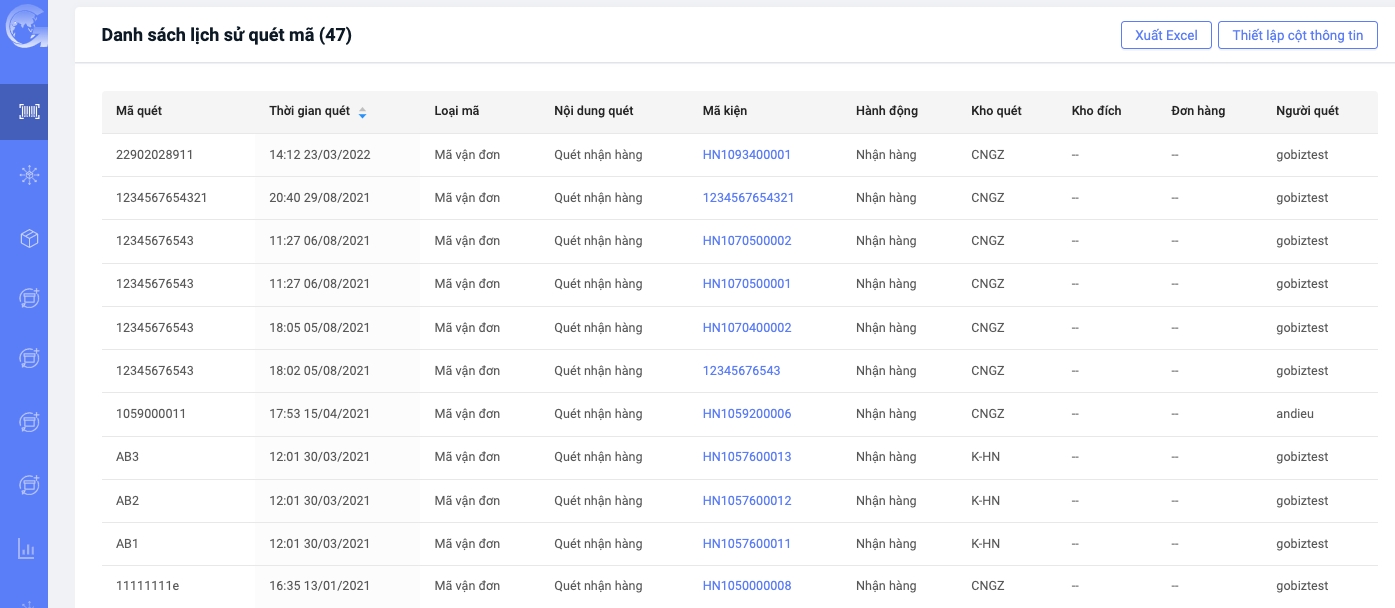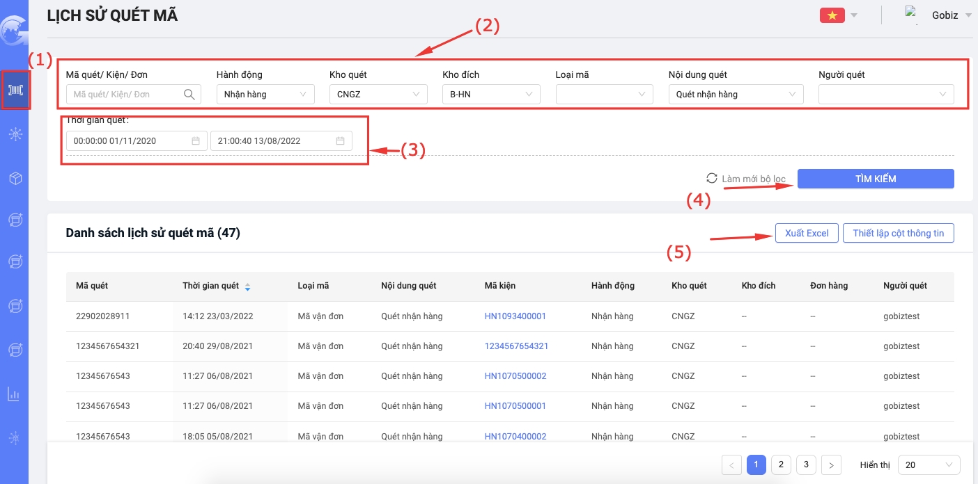 Menu => Vận hành => Lịch sử quét mã (1) => Chọn điều kiện cần lọc (2) => Chọn thời gian lọc mong muốn (3) => Tìm kiếm (4) => Xuất file excell báo cáo (5).