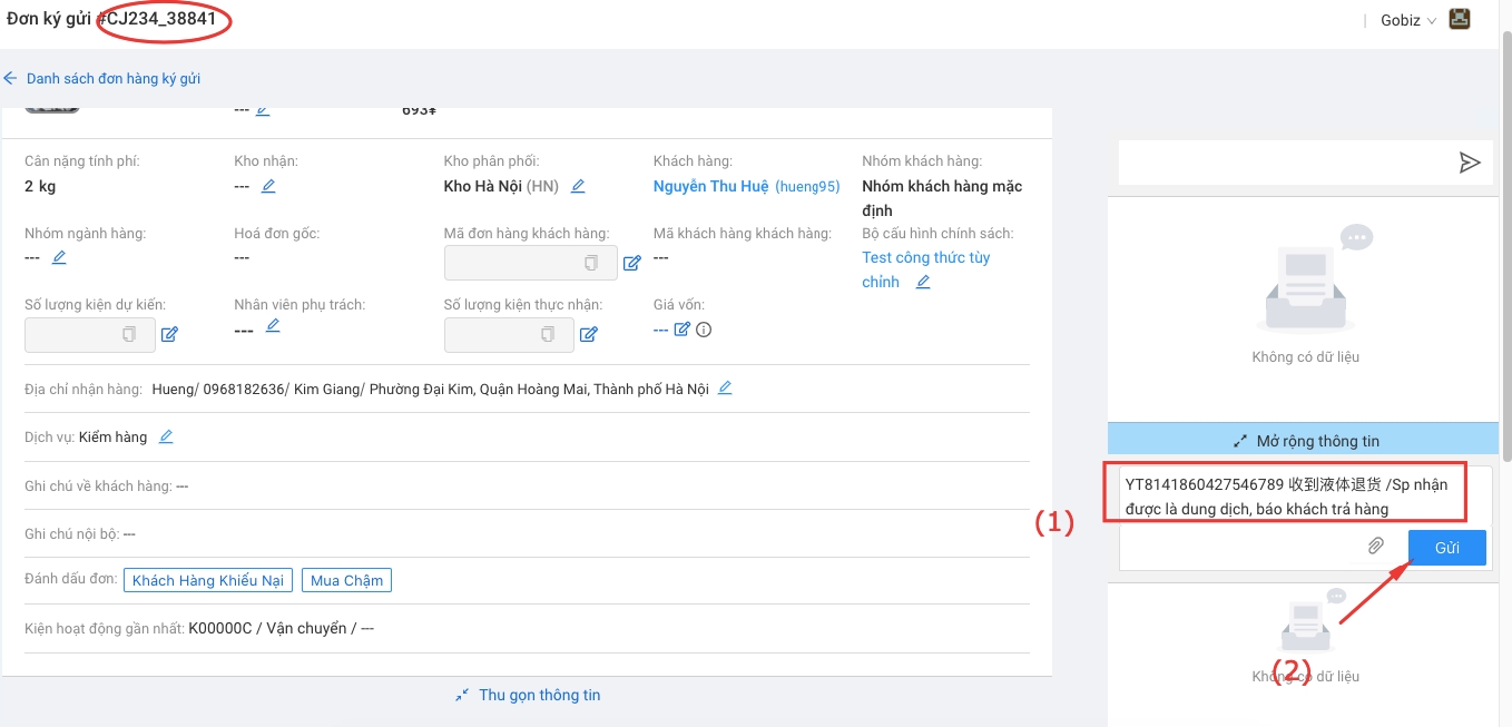 Mở đơn hàng có sai lỗi => Điền nội dung (1) => Bấm gửi (2).