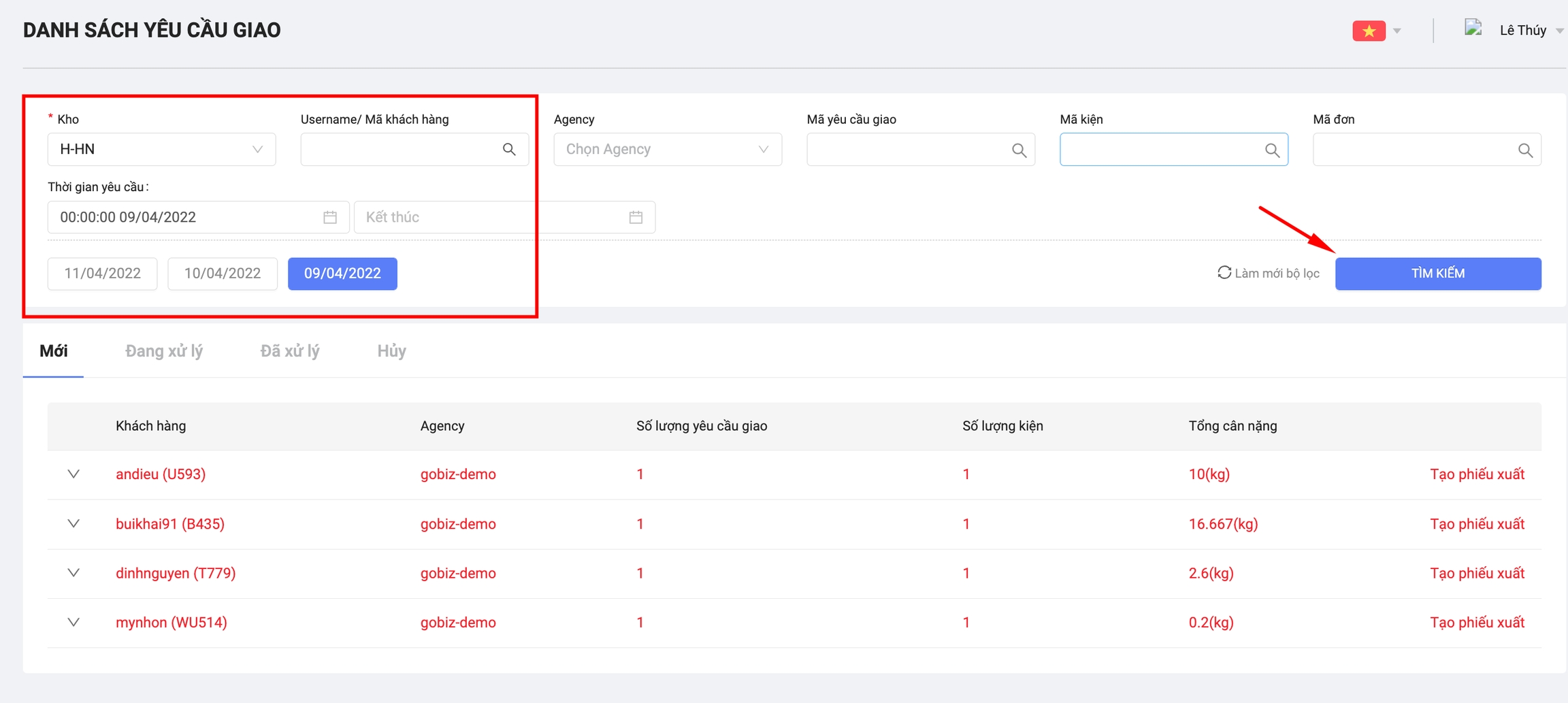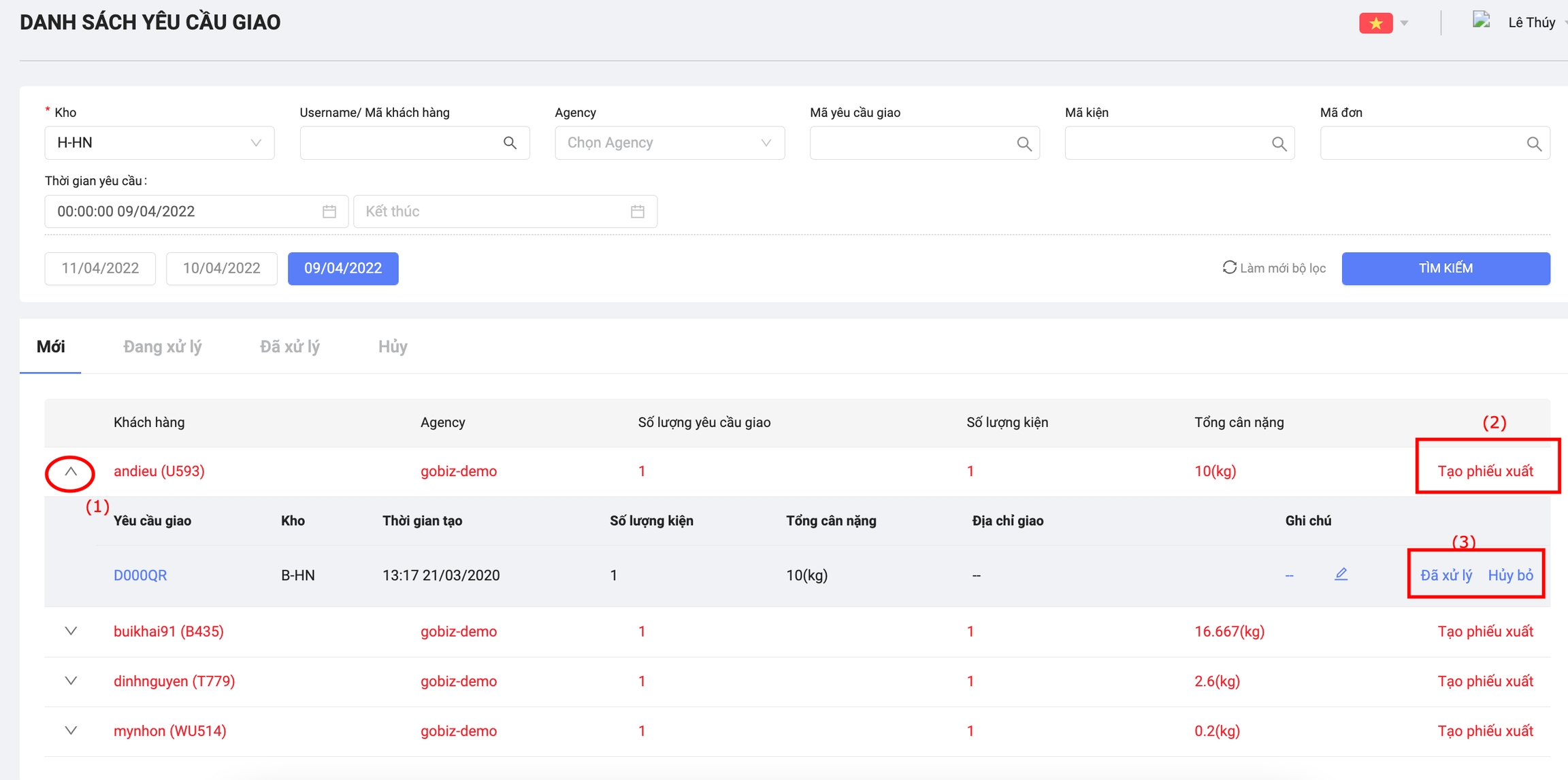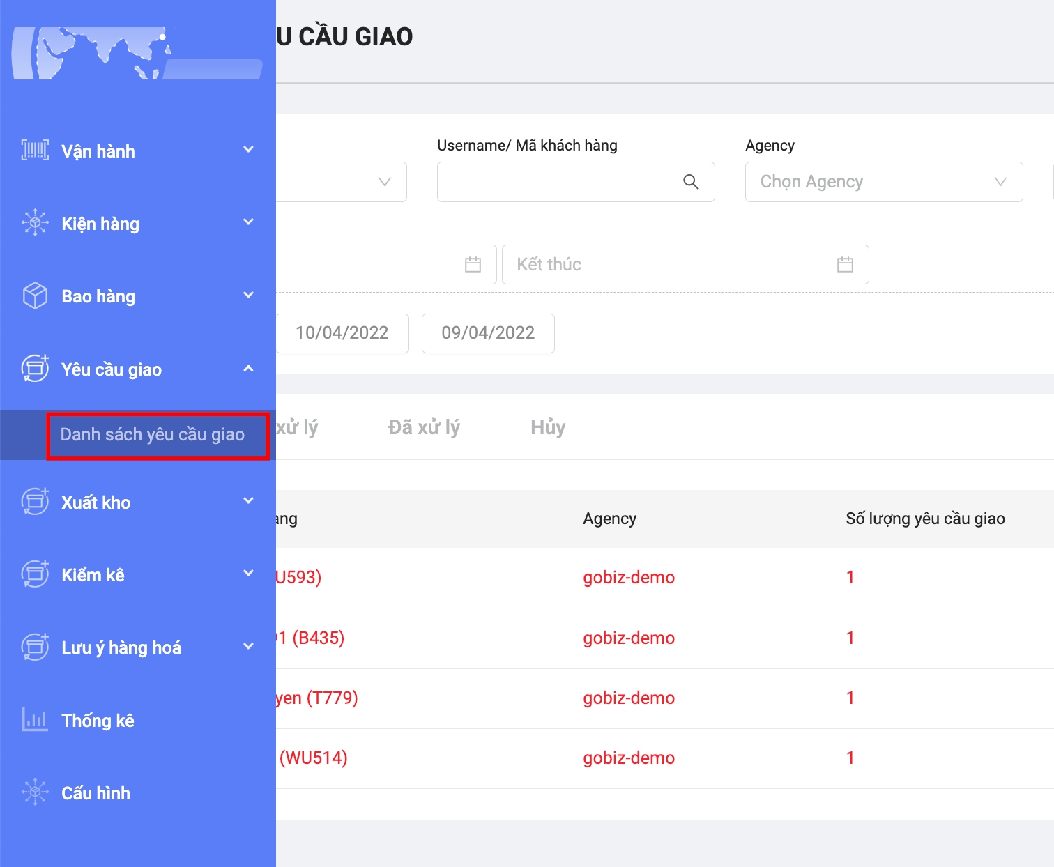 Hàng về Việt Nam, khách chủ động tạo yêu cầu giao hàng, nhân viên kho truy cập Menu => Yêu cầu giao => Danh sách yêu cầu giao