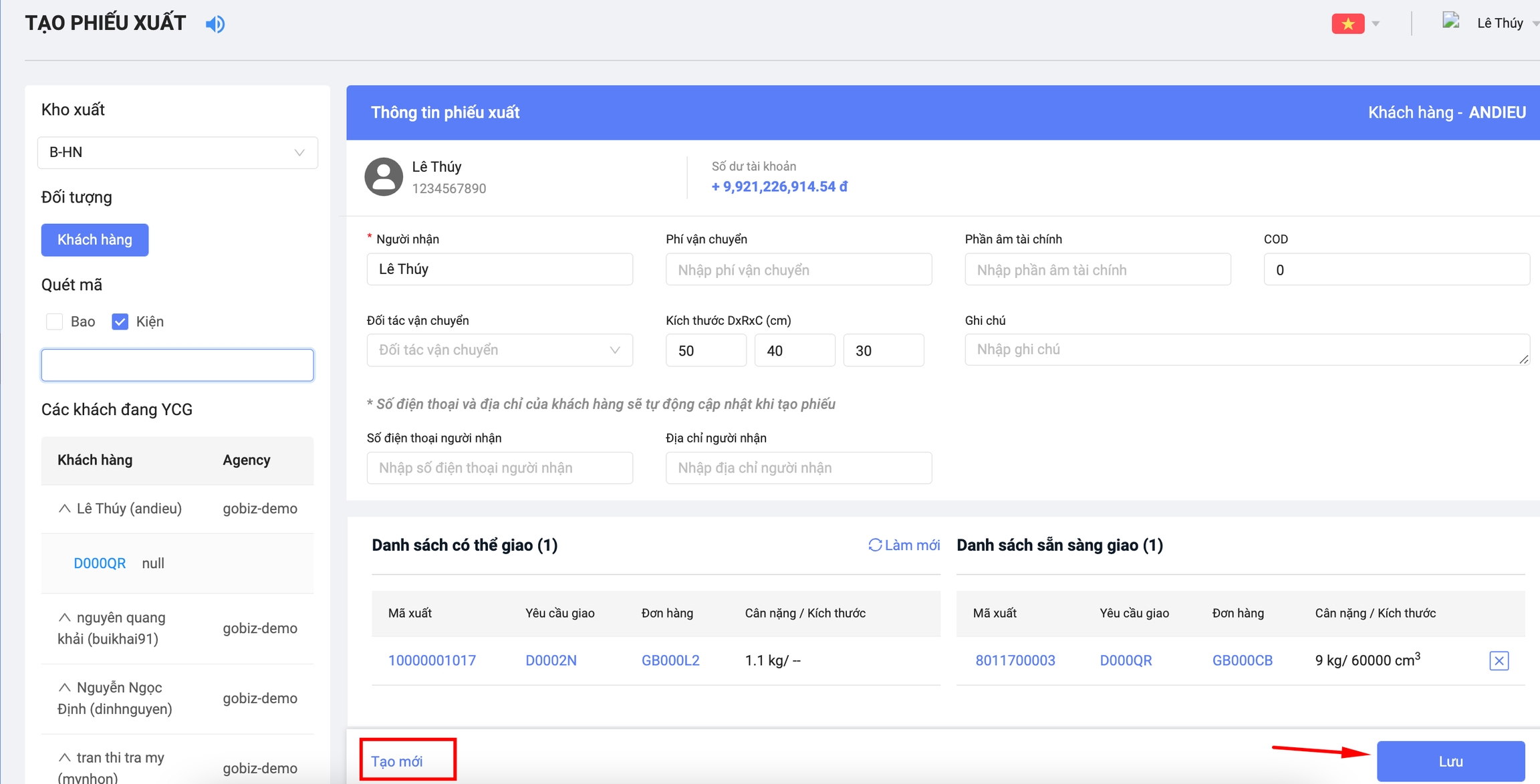 Bước 4: ấn Lưu sẽ tiến hành tạo ra phiếu xuất. Nếu ấn Tạo mới sẽ quay lại màn hình chọn khách hàng để tạo phiếu