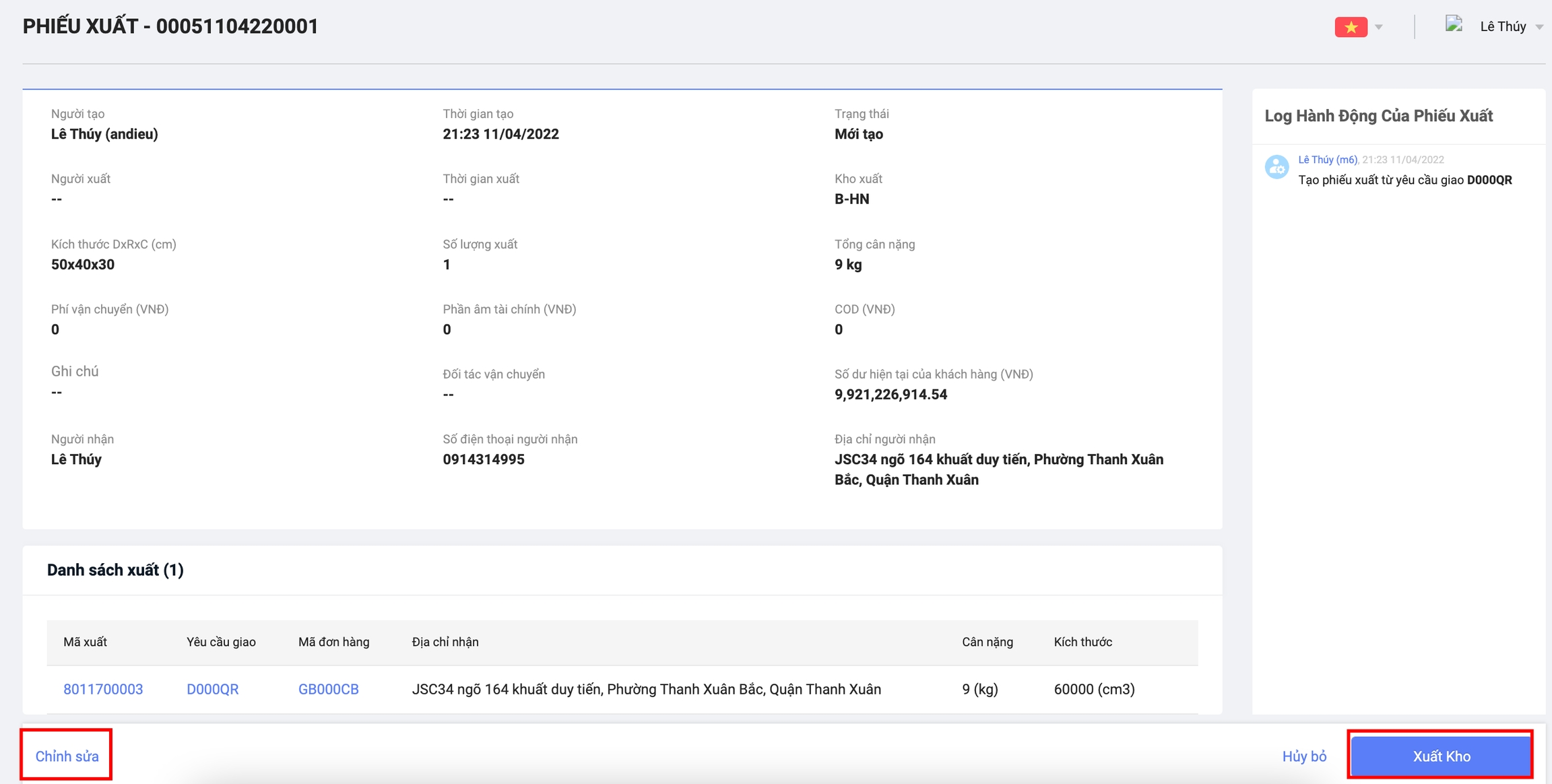Hệ thống sẽ chuyển hướng sang giao diện Tạo phiếu xuất hàng