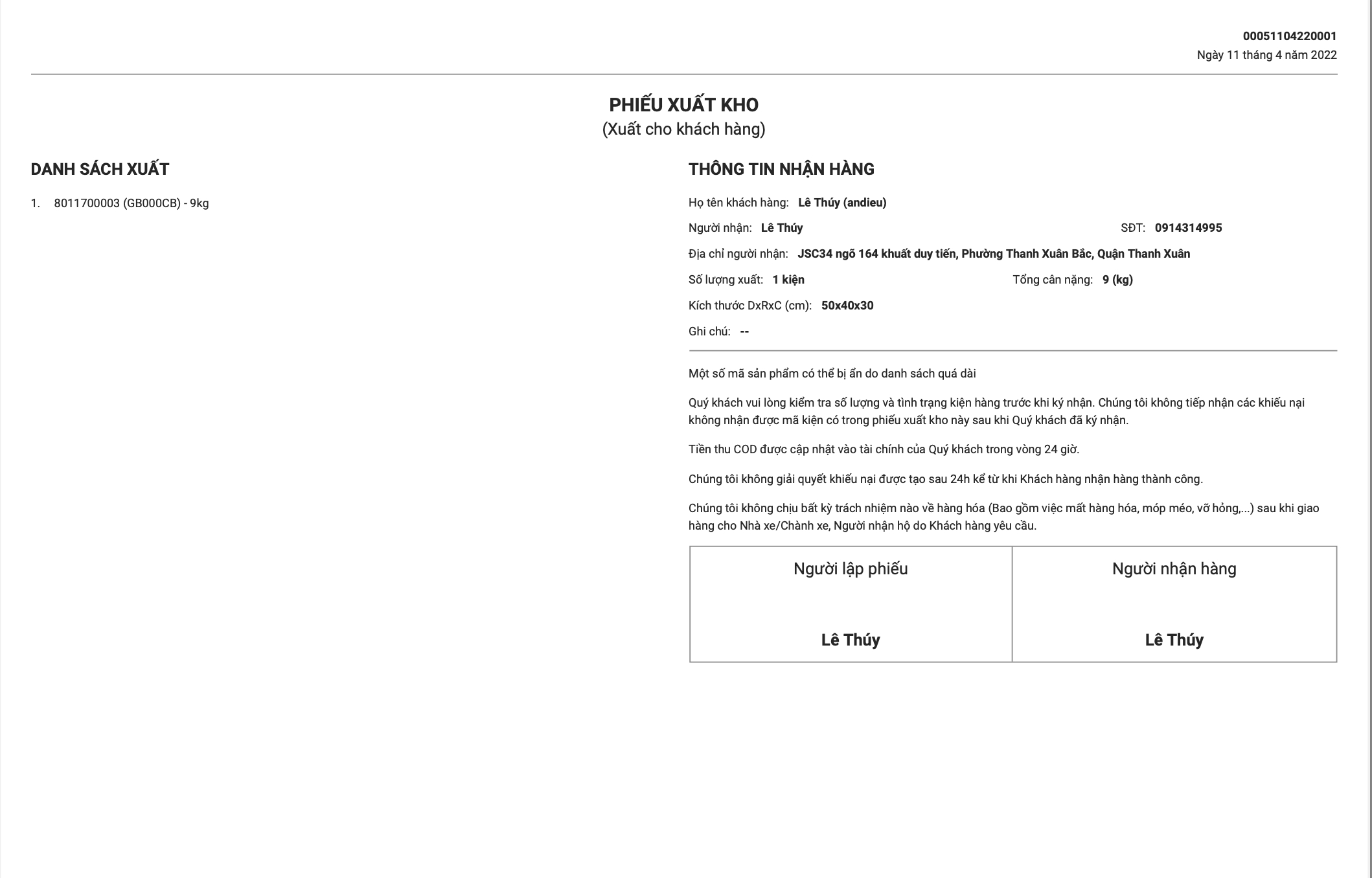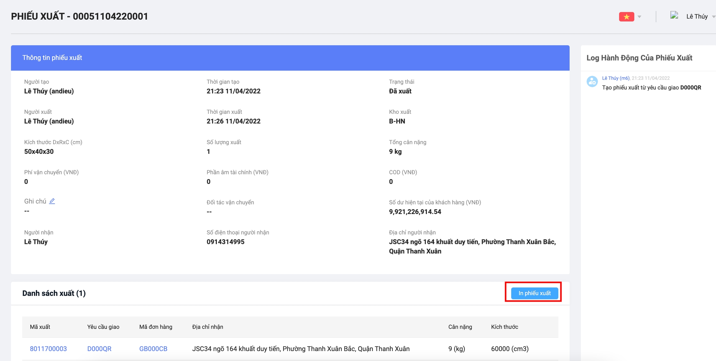 Bước 6: In phiếu xuất, đính kèm hàng hóa khi giao tới khách