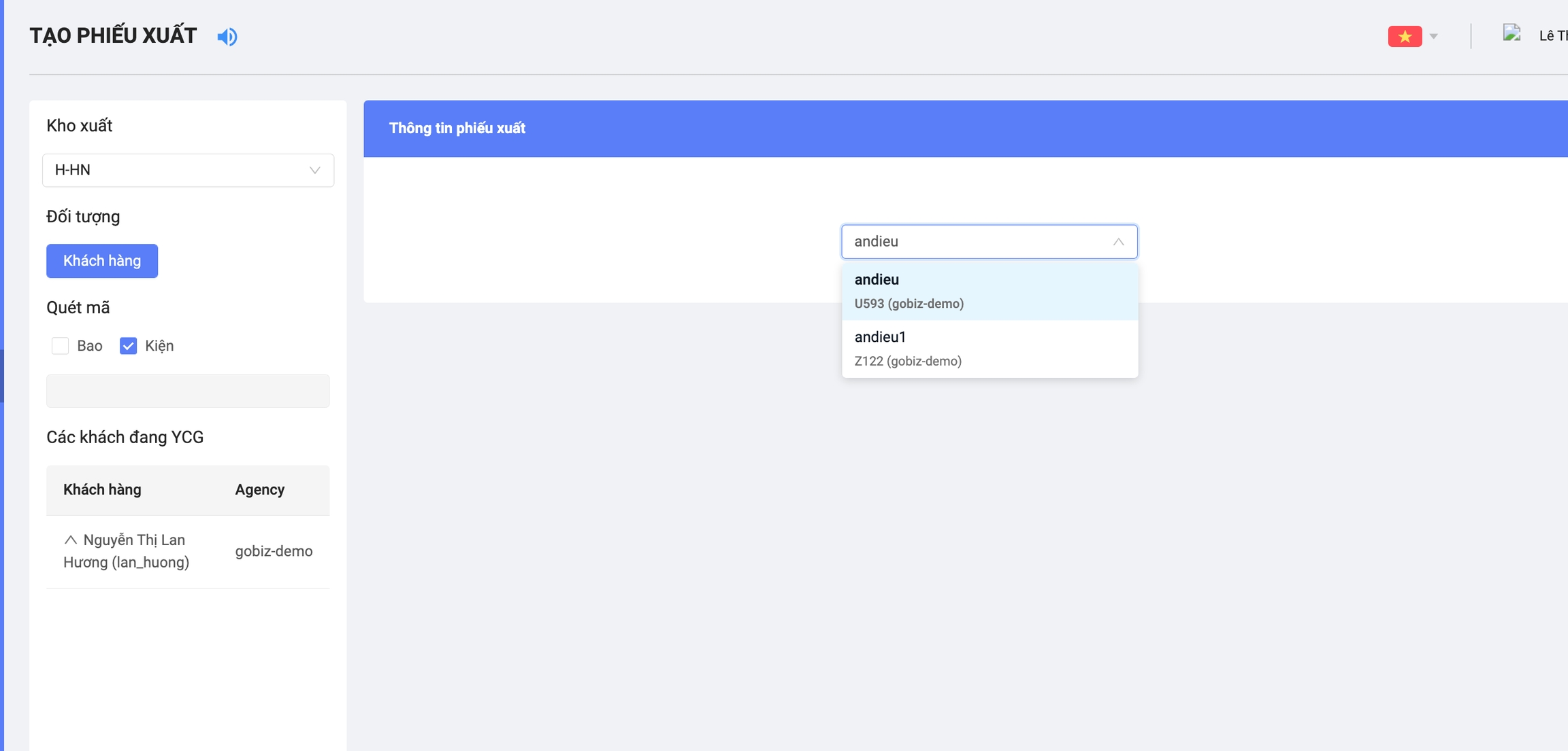 Bước 2: Chọn Kiện/Bao để thêm vào phiếu xuất cho đối tượng đã chọn