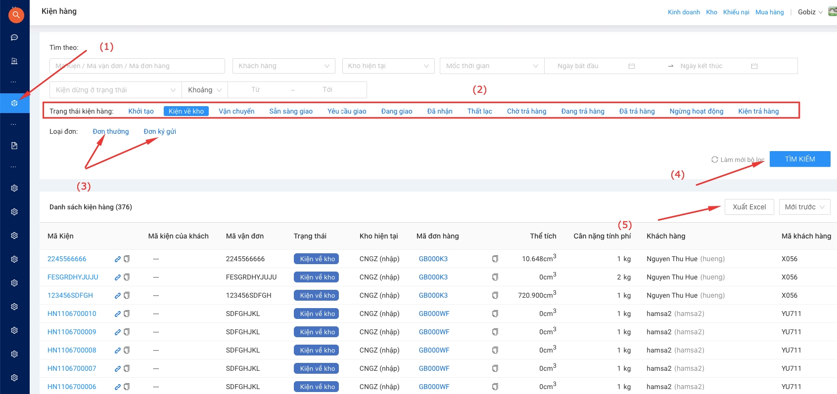 Vào menu => Danh sách kiện (1) => Chọn trạng thái kiện cần check (2) => Chọn loại đơn (3) => Bấm tìm kiếm (4) => Xuất file excell (5).