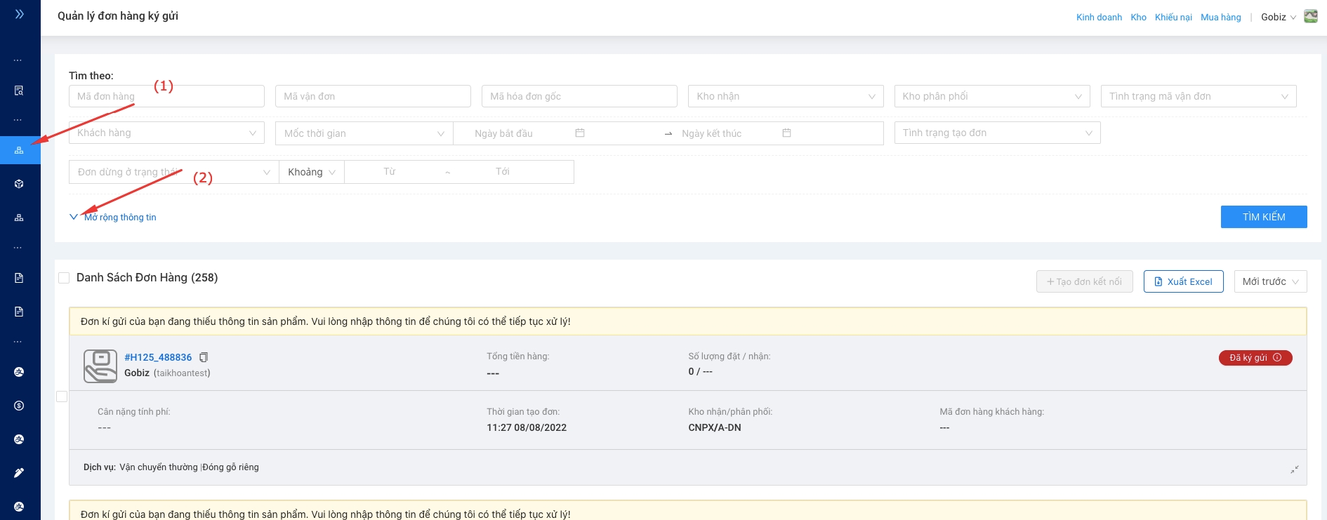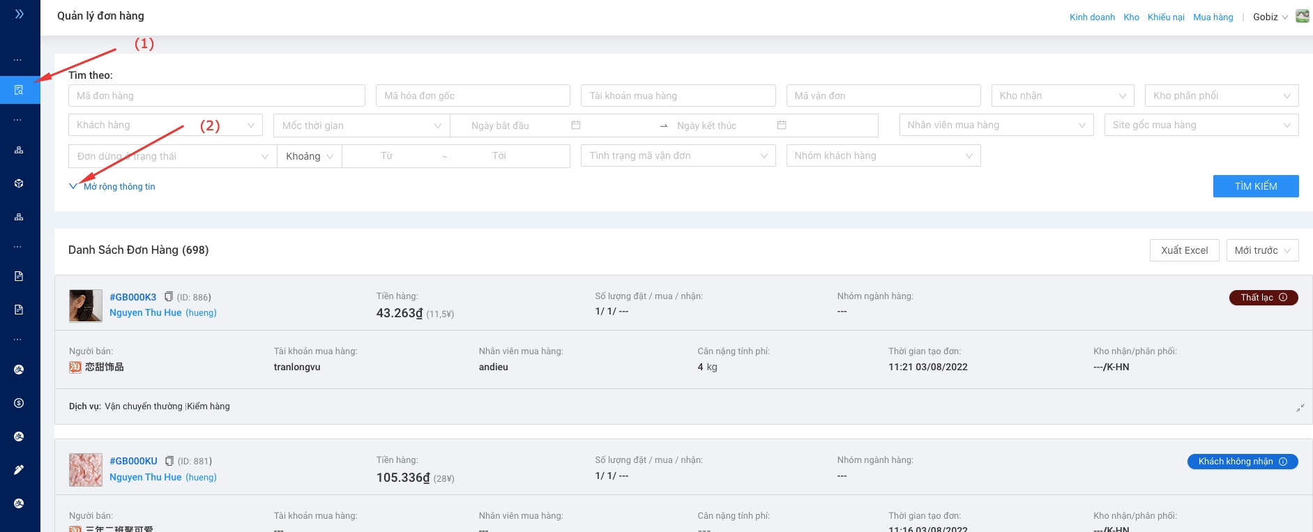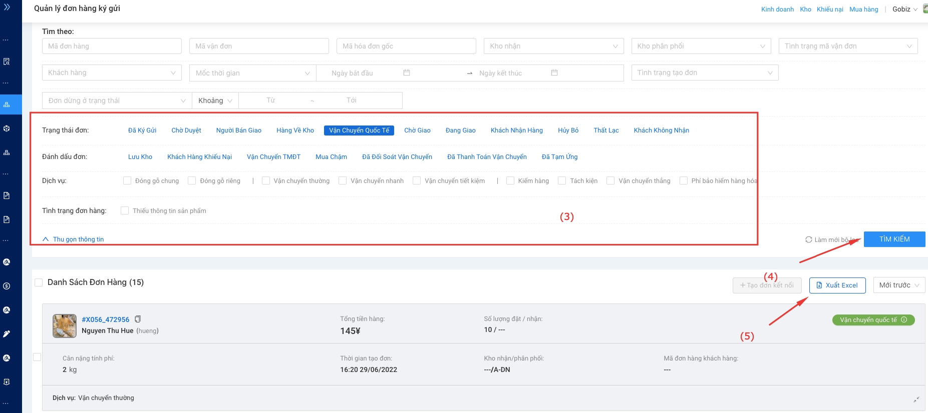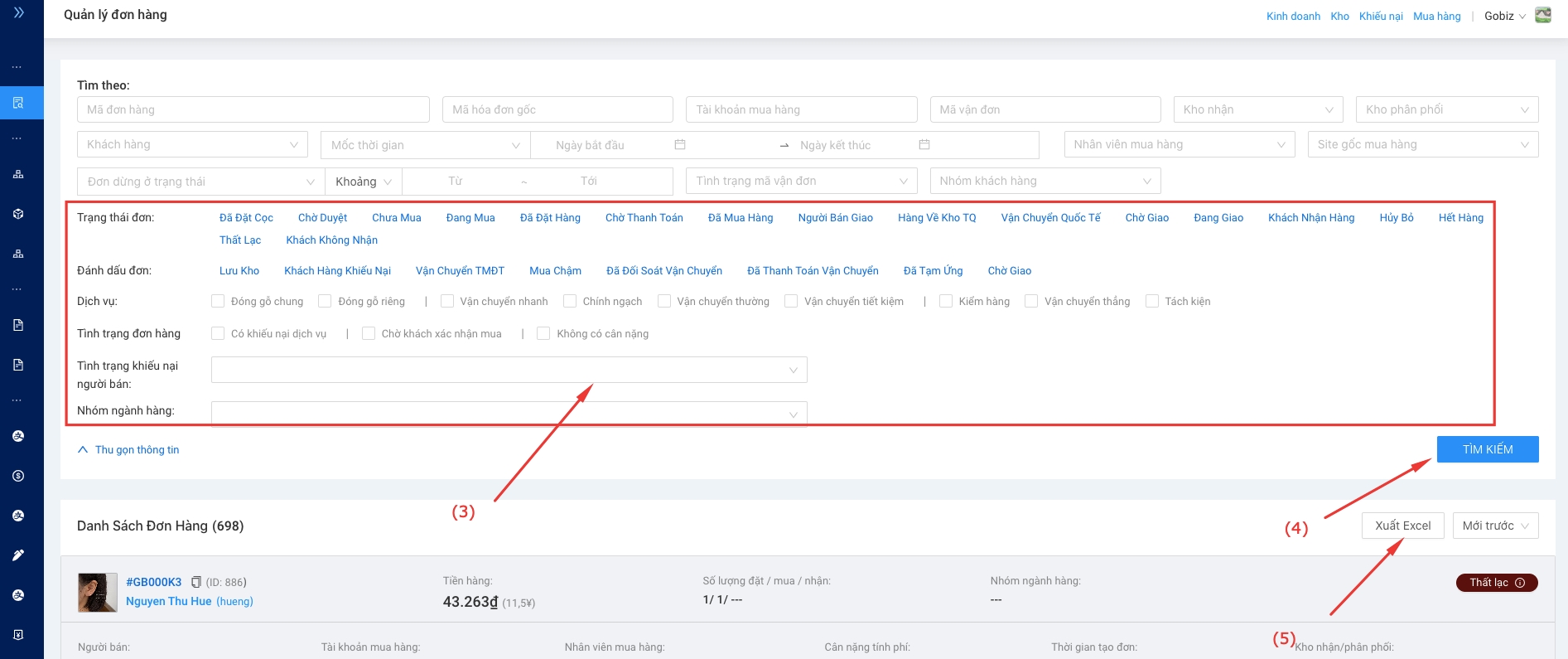 Vào menu => Chọn danh sách đơn (1) => Chọn mở rộng thông tin (2) => Chọn trạng thái/dịch vụ đơn cần tìm kiếm (3) => Bấm tìm kiếm (4) => Xuất file excell (5).