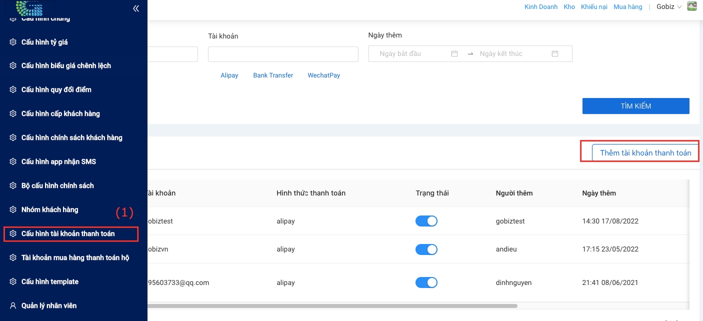 Bước 1: Menu => Cấu hình tài khoản thanh toán (1) => Thêm tài khoản thanh toán (2)