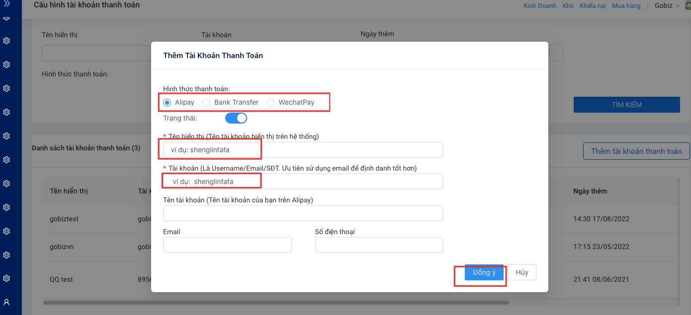 Bước 2: Điền thông tin hình thức thanh toán => Tên và tài khoản thanh toán => Đồng ý