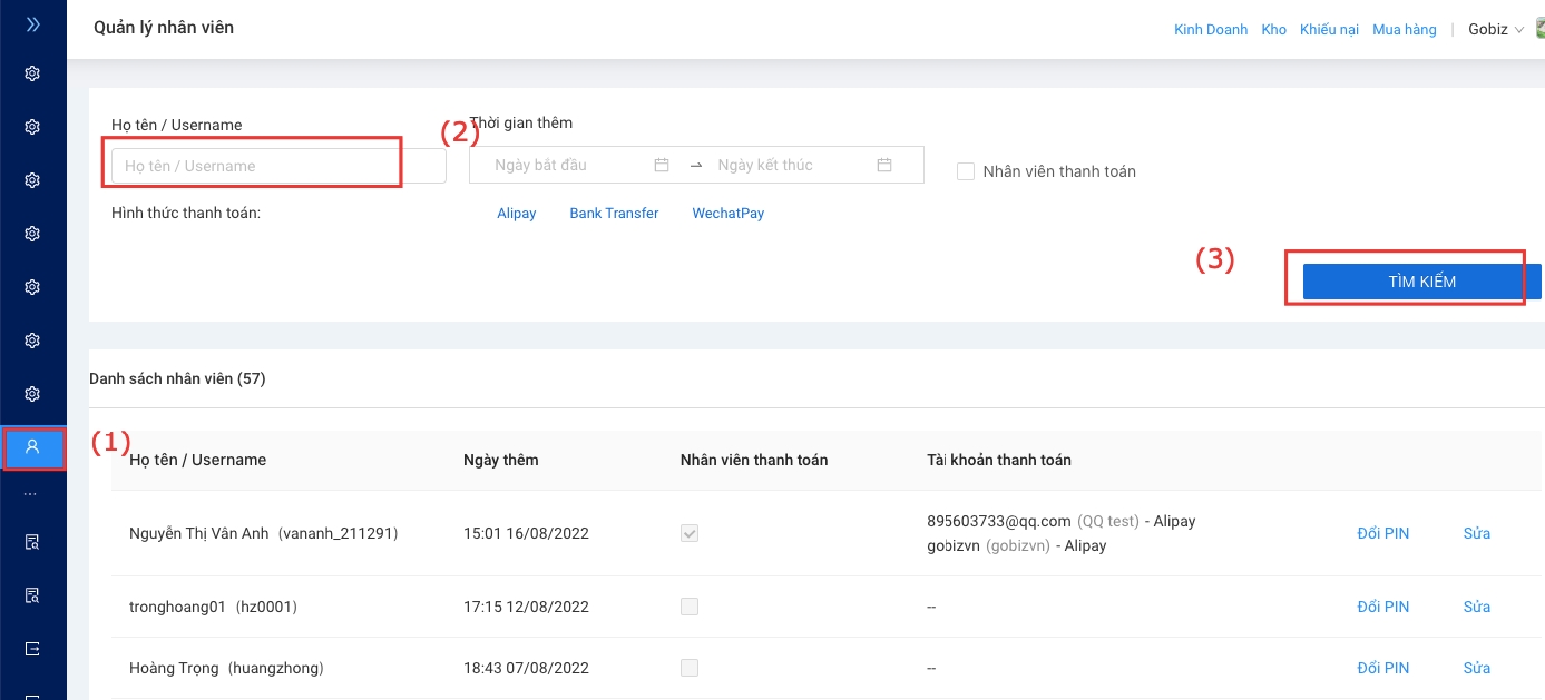 Bước 1: Menu => Quản lý nhân viên (1) => Điền user nhân viên muốn cấp quyền (2) => Chọn tìm kiếm (3).